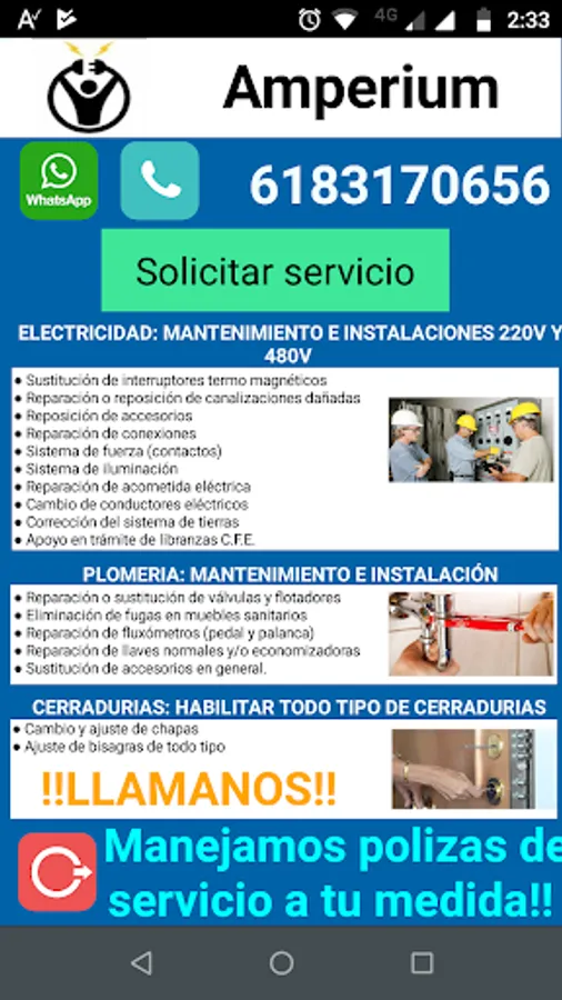 Application with which you can request service for the resolution of electricity problems (residential, commercial), plumbing and lockout. With very attractive service policies and tailored to your needs, contact us to advise without obligation.