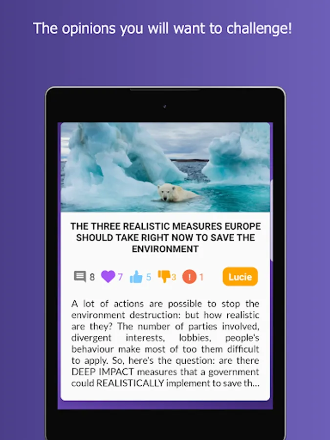 A strong opinion in politics? Passionate about technology? Read how other users structure their thoughts and opinions in articles to convince you. Participate to debates. Vote for the most convincing articles. Challenge people's opinions by reacting to articles at a paragraph level.