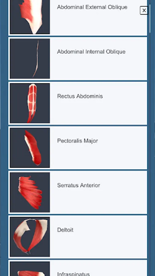 Full-angle in-depth detailed view of more than 600 muscles in the human body, including the complete human muscle anatomy, with a 3D model to show the human muscle system.