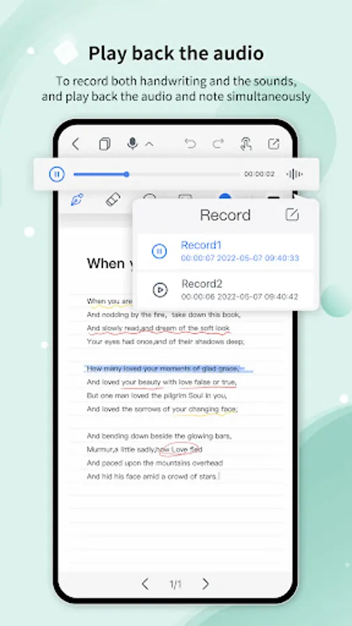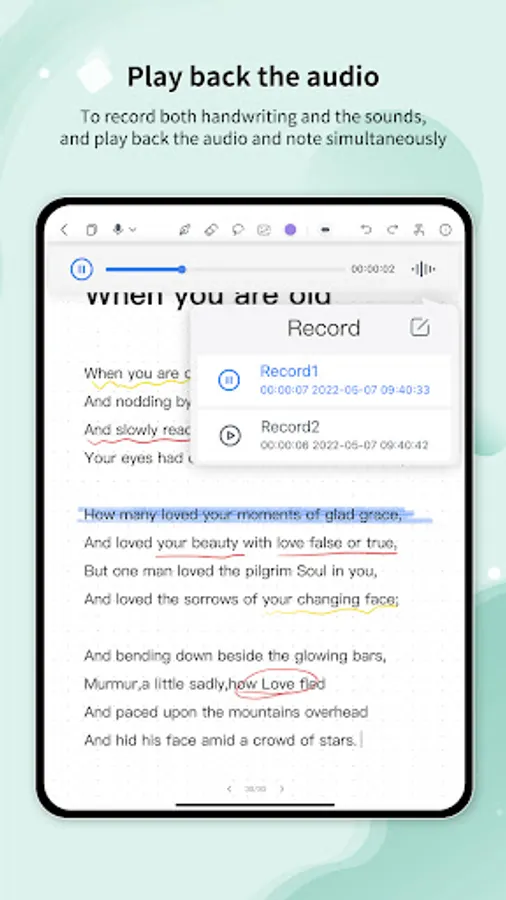 - Make a recording while simultaneously writing on a notebook in Huion Note. Tap a certain word or mark in the note, and the audio will jump to the corresponding point.