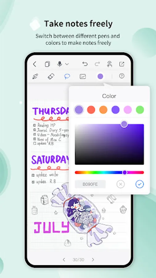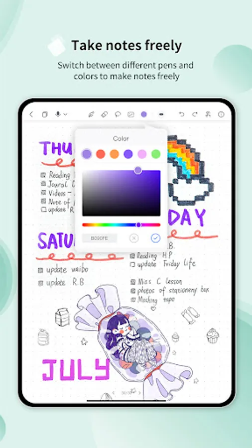 Diverse editing tools such as pens, eraser, lasso tool, and so on are available in Huion Note to help you take class notes conveniently, write memos quickly, and create beautiful diaries.