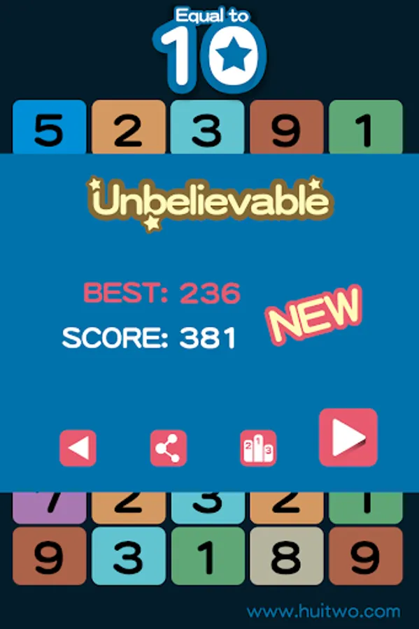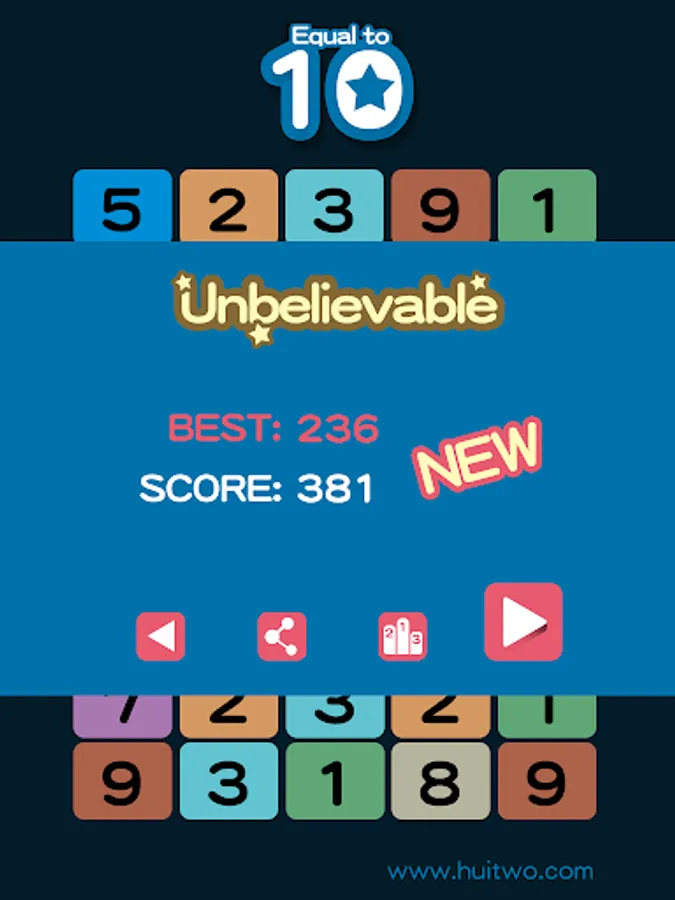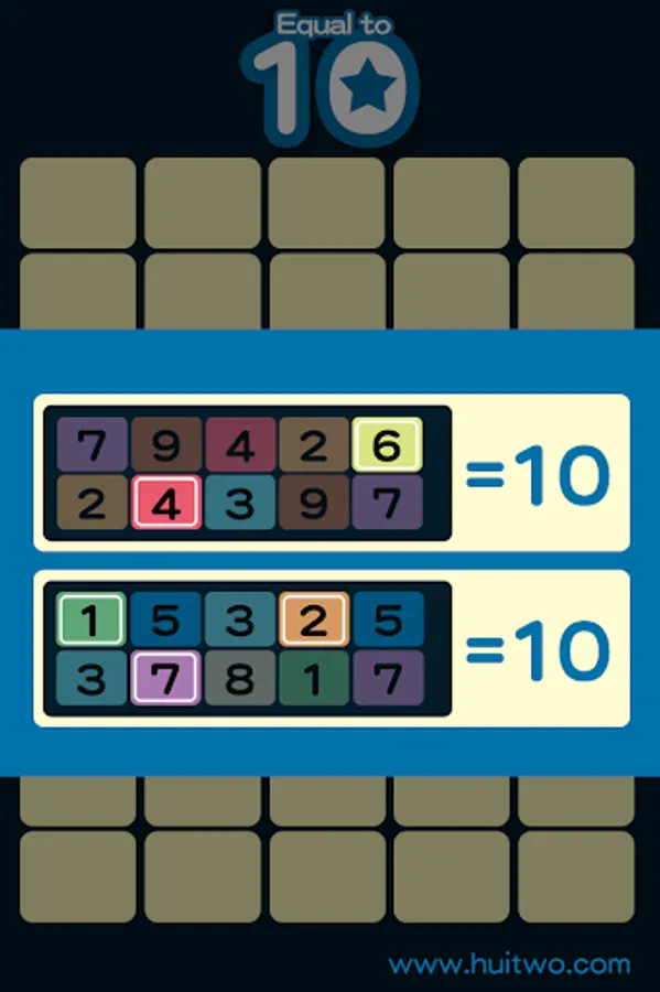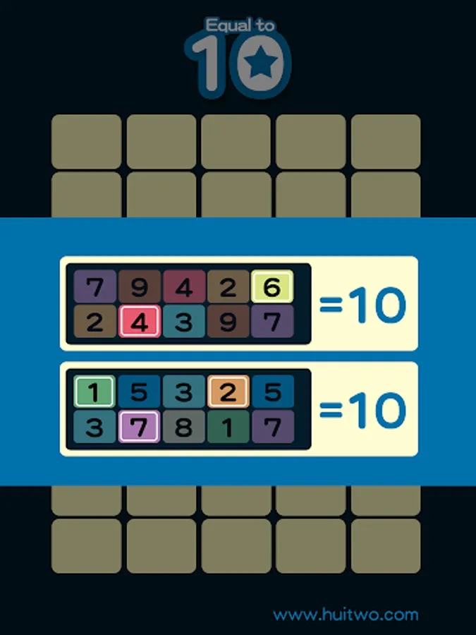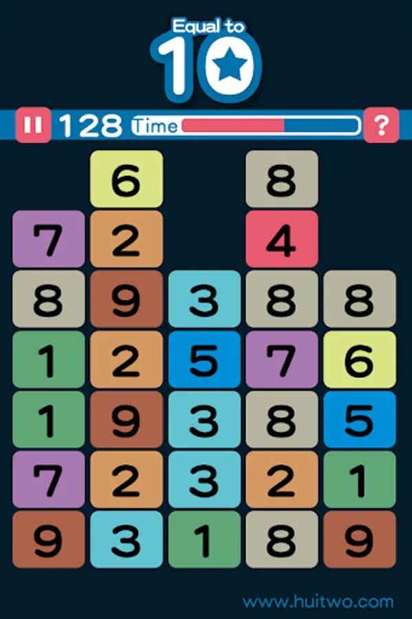 Getting tired of lavish meals, let's occasionally try some light styles for a change. "Equal To 10" another casual game that you don't want to stop as you play it. We neither touch stone nor food, but add the figures up to 10, such as 1+9,2+3+5,3+7,1+7+2. Simple to play, you can touch whichever figure you like.
