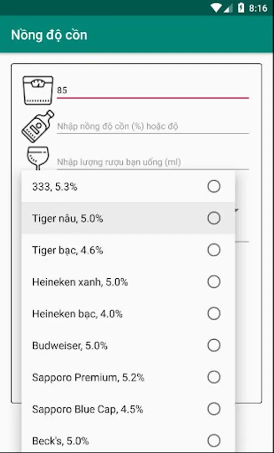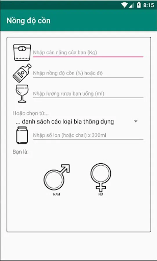 • Relative alcohol / blood alcohol concentration based on weight, alcohol and alcohol consumption.