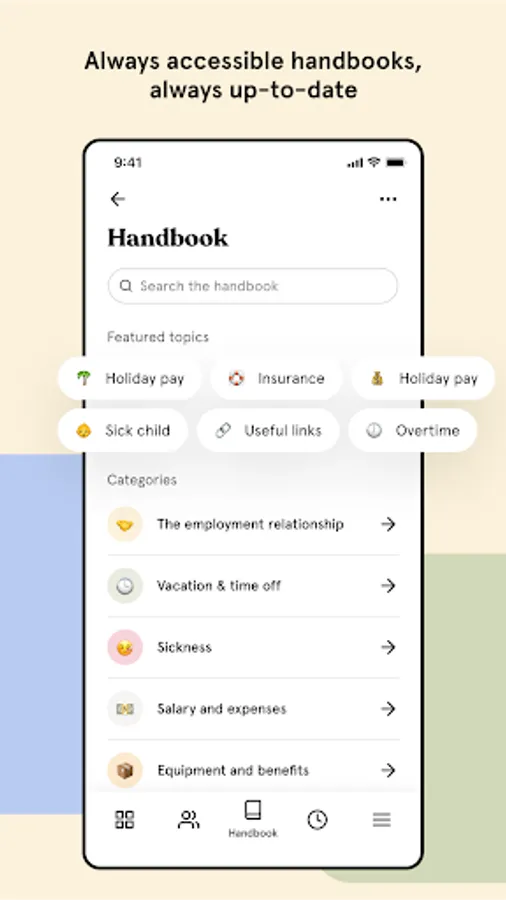 - Easily accessible information with a modern employee handbook containing internal guidelines and laws and regulations.