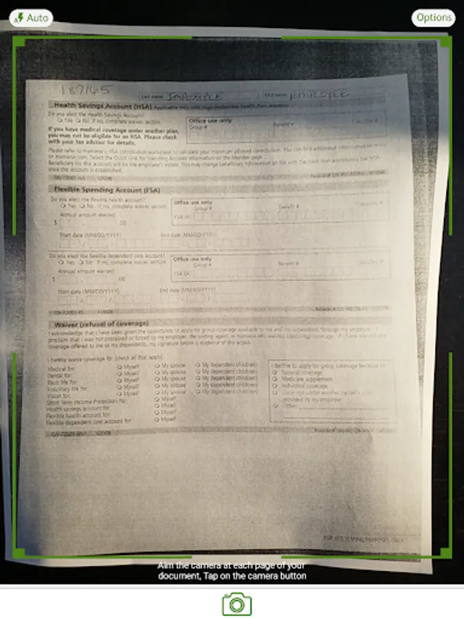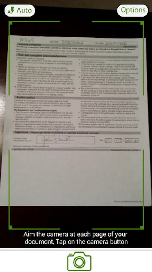• Point your camera at each page of your document and follow the instructions on the camera’s display screen. The camera will focus and capture the image and indicate the number of pages captured up to the maximum of 20 pages.