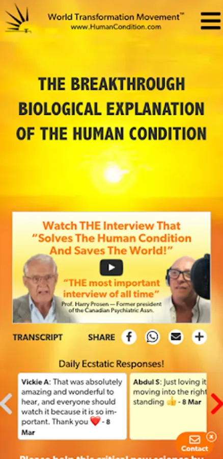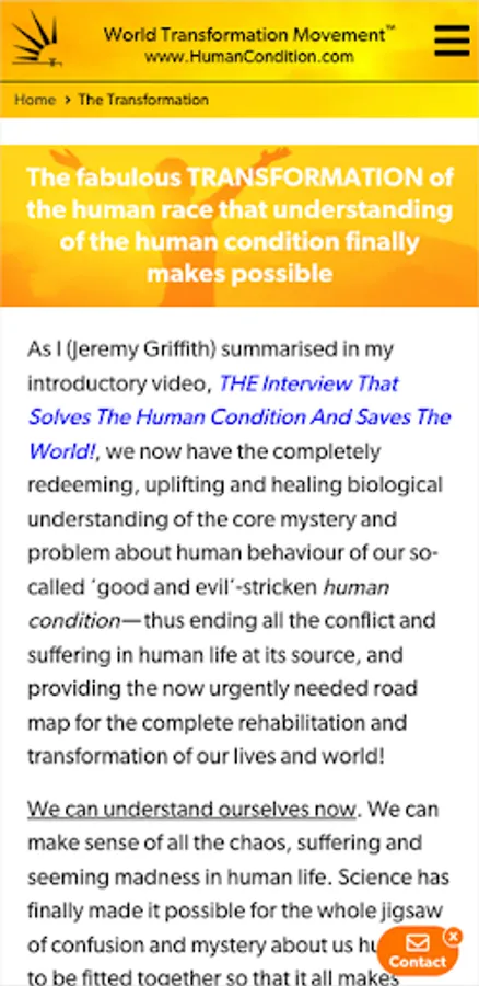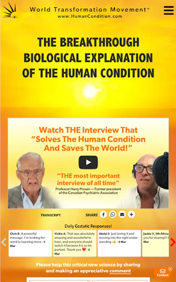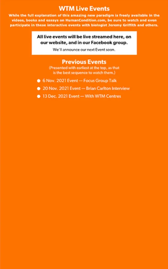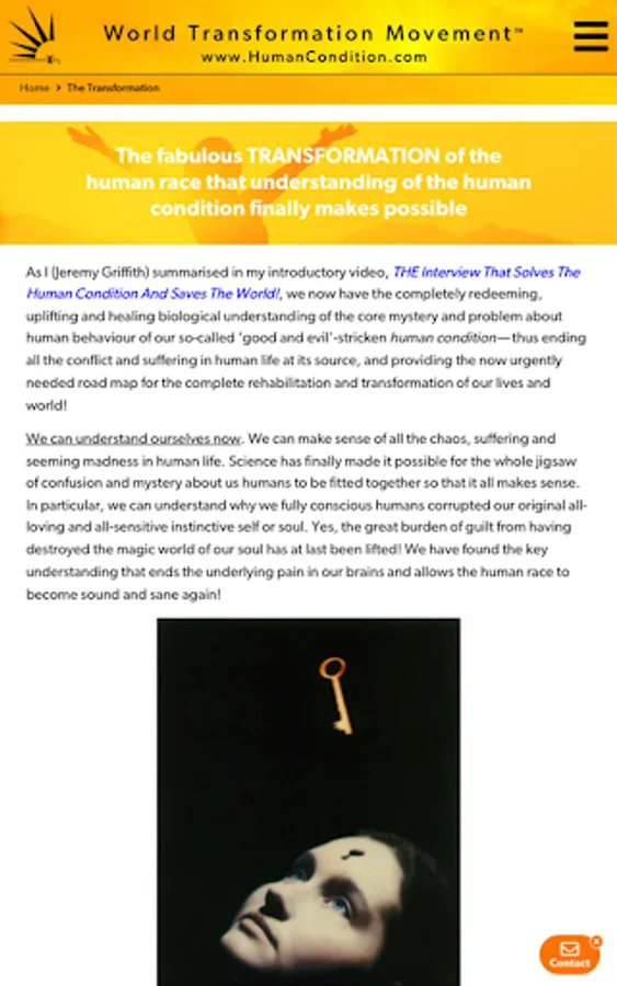 The World Transformation Movement (WTM) is a global not-for-profit charity that promotes Australian biologist Jeremy Griffith’s breakthrough resolution of the underlying problem in all human affairs of the human condition — thereby ending human conflict and suffering at its source, and providing the now urgently needed road map for the complete transformation of our lives and world!