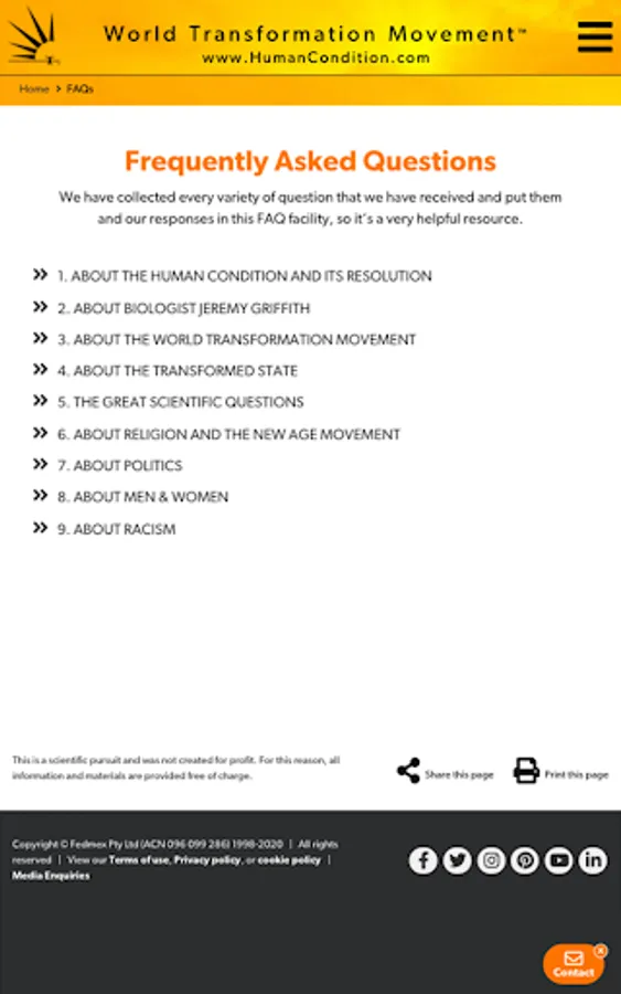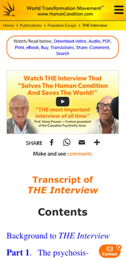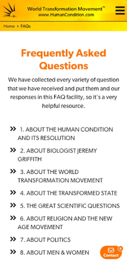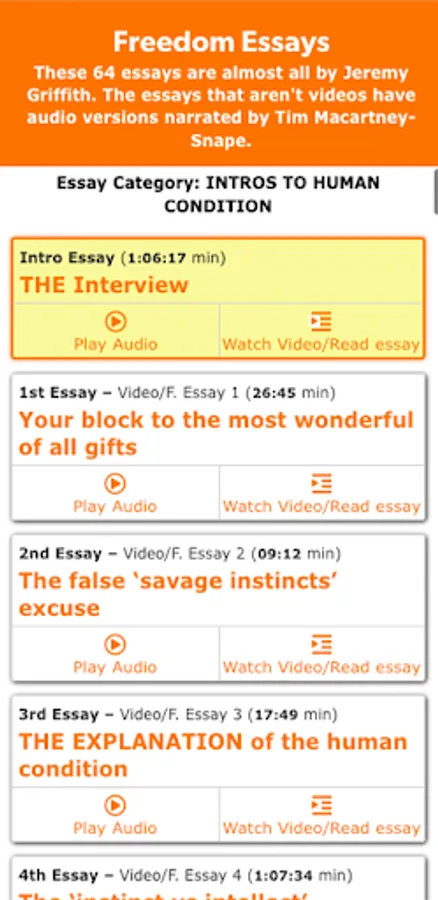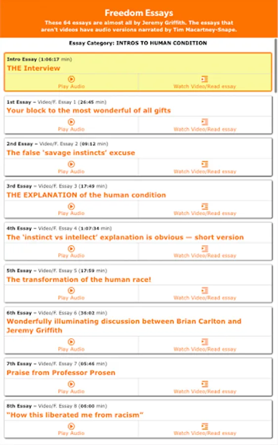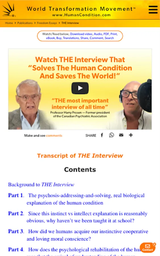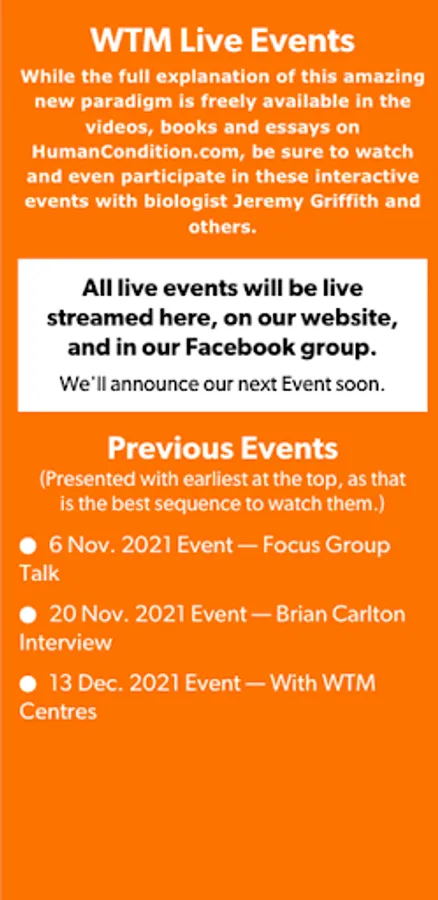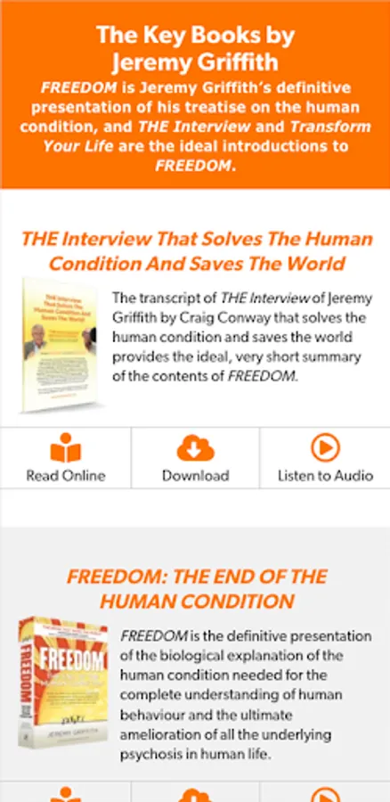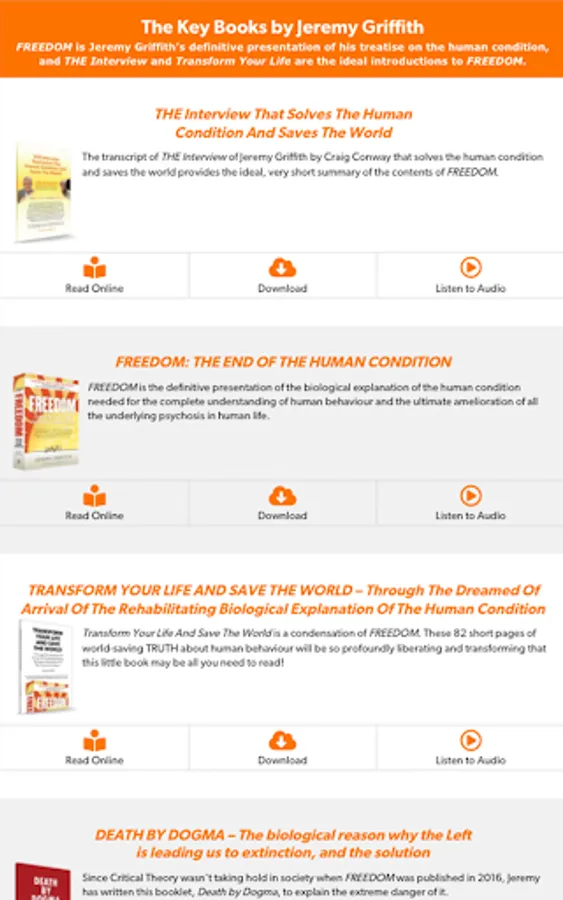 The WTM App offers you easy access to various WTM presentations. These presentations include ‘THE Interview’, which is the ideal introduction to Jeremy Griffith’s treatise; and the Freedom Essay series, which (unless otherwise stated) were written by Jeremy, and cover all the main subjects in his definitive book ‘FREEDOM: The End Of The Human Condition’. The audio versions of the books and essays include audios by Jeremy and others, as well as narration by Tim Macartney-Snape AM OAM, a WTM founding director.