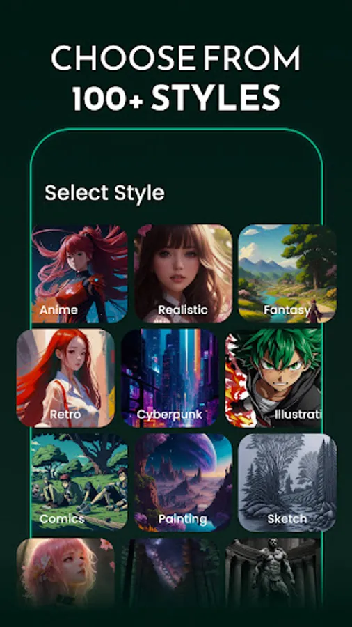 Choose from these captivating styles to create AI-generated artworks that reflect your unique creativity. With a simple selection, witness the magic unfold as your chosen style comes to life, transforming your ideas into stunning masterpieces. Explore the endless possibilities and let your imagination soar as our app seamlessly merges your selected style with the power of AI art generation. Elevate your artistic journey with our app's rich style collection, where inspiration meets limitless creativity.