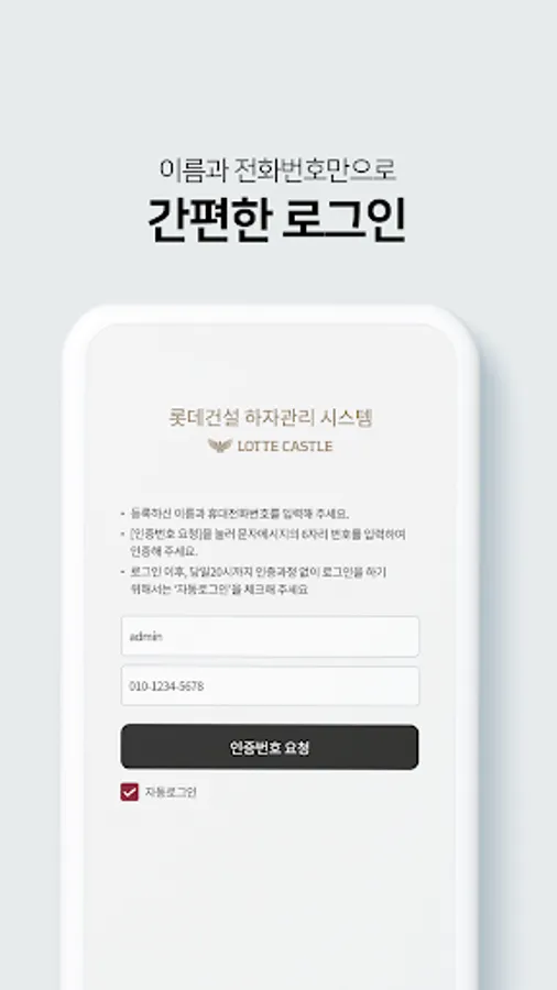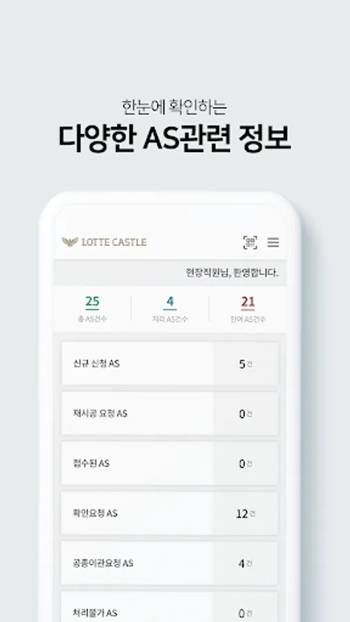 Juan It is an application for apartment AS mobile processing provided for Lotte E&C employees and partner employees, and AS engineers.