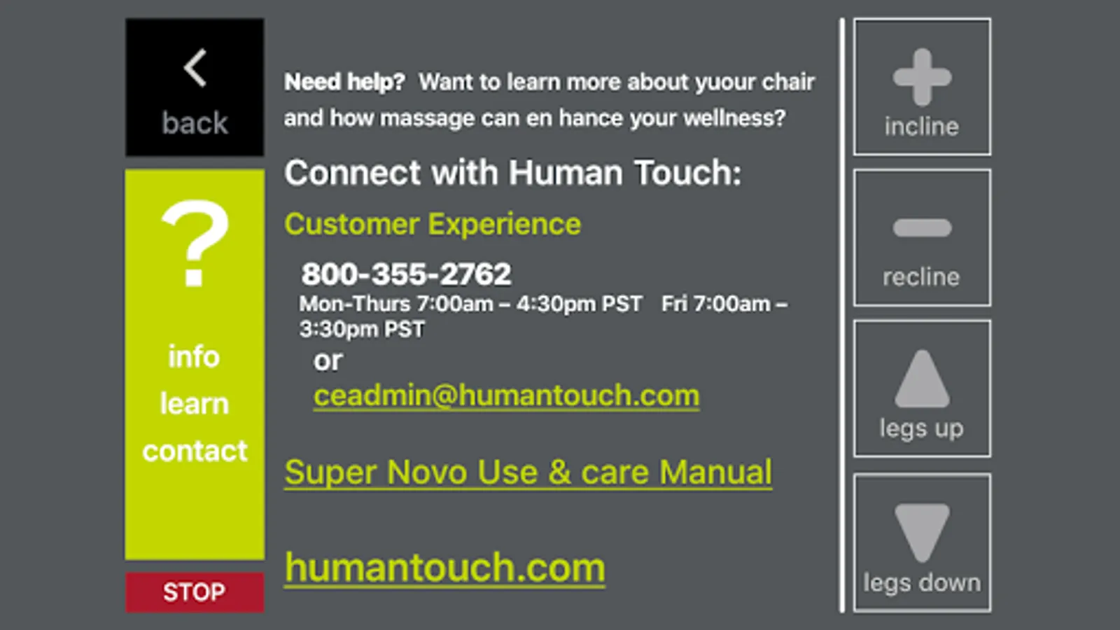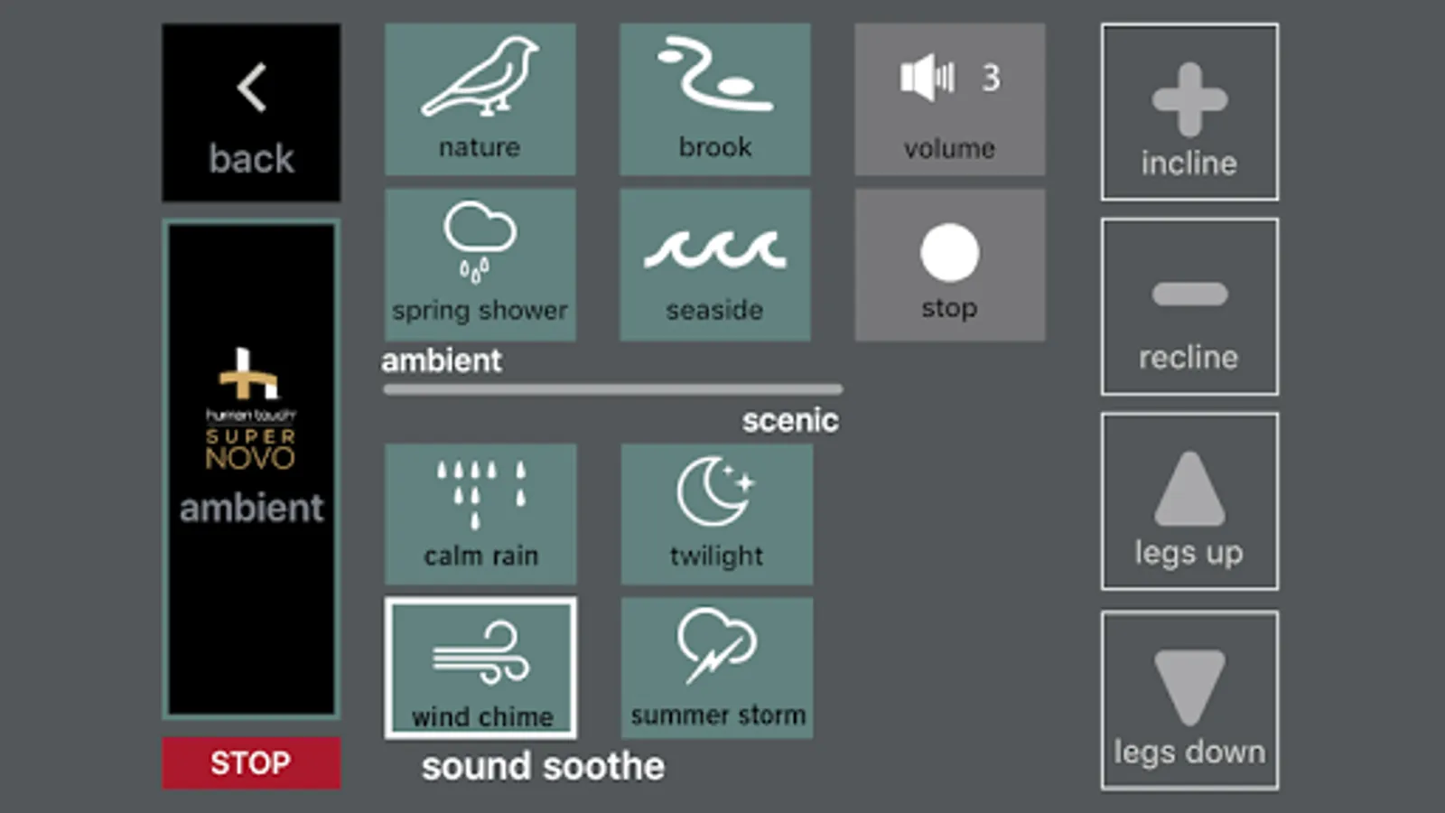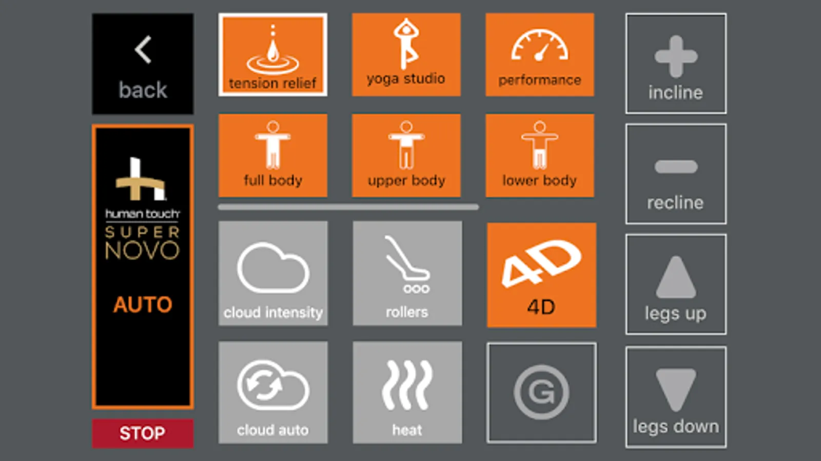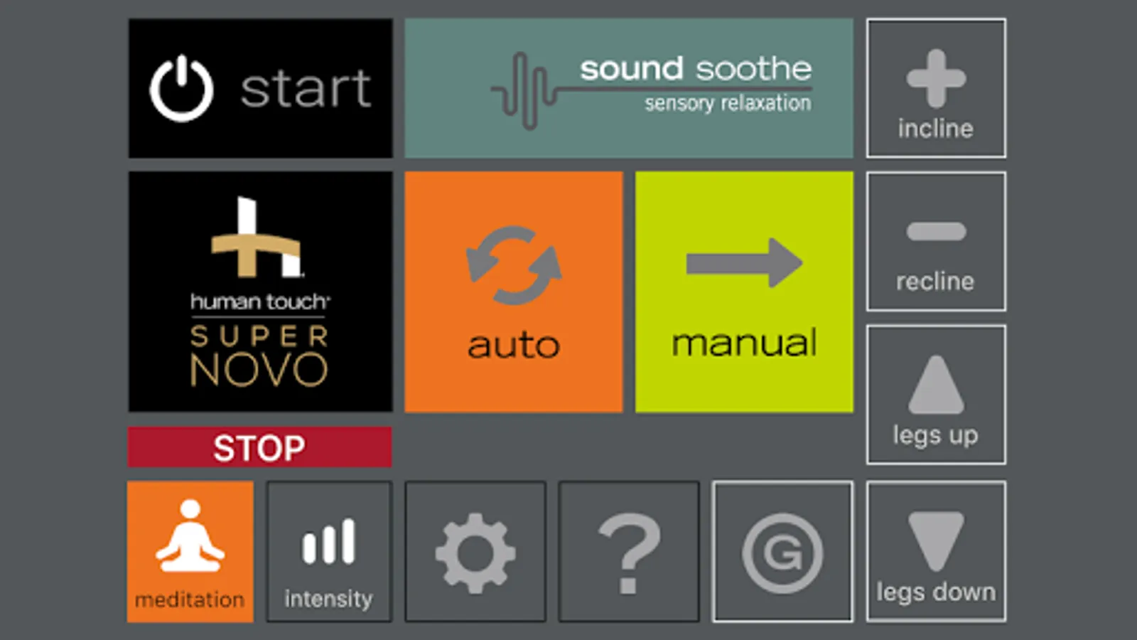 The Super Novo App is an elegant and functional way to control your Human Touch® Super Novo massage chair through your phone or tablet. With a wide array of features presented in a sophisticated design, you have a smart, easy-to-use controller at your fingertips. Simply connect your device via Bluetooth to your Super Novo massage chair and you are ready to sit back, relax, and completely enjoy your Human Touch experience.