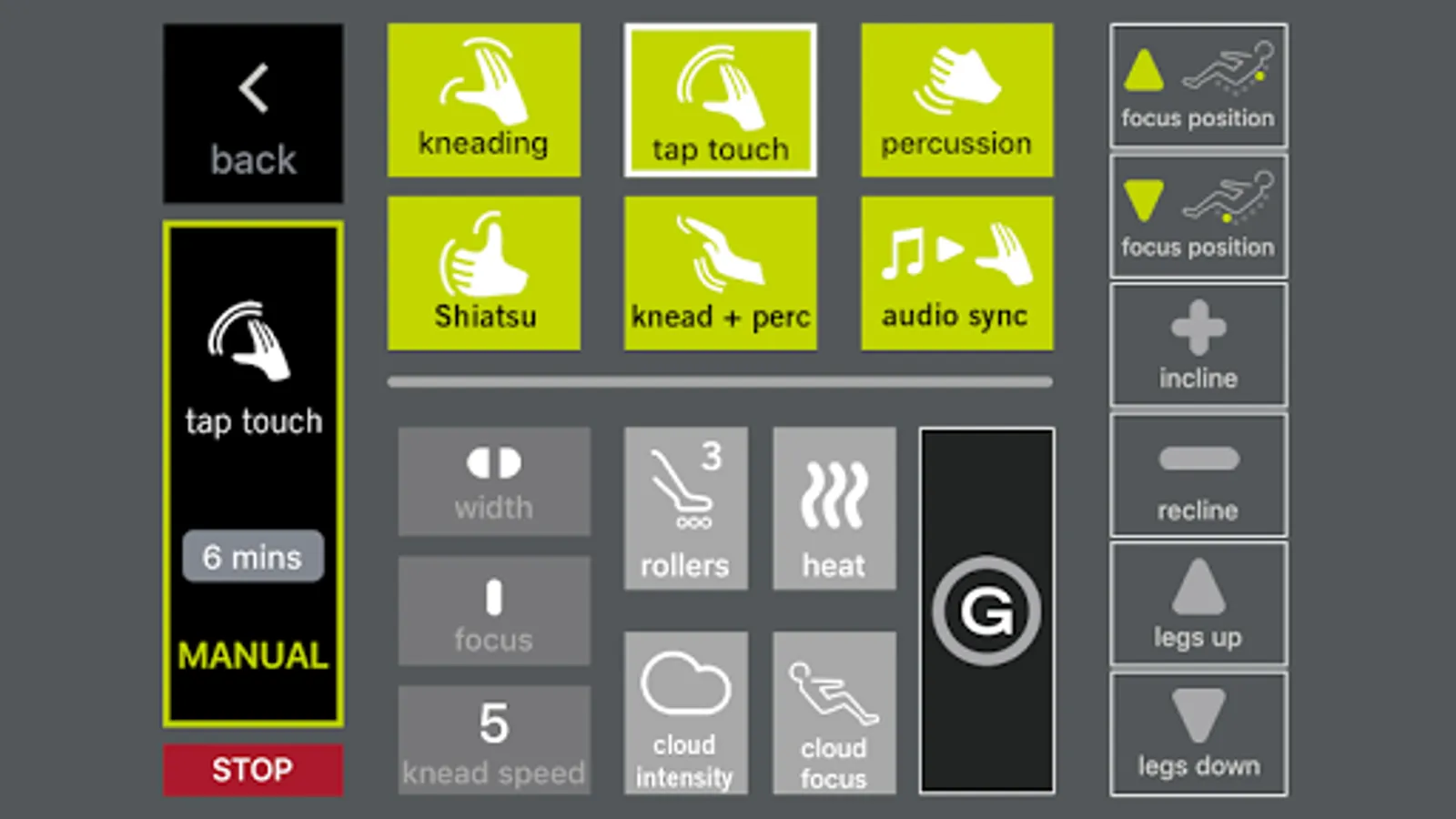 • Press the “G” button to be instantly taken to a neutral posture, zero gravity position