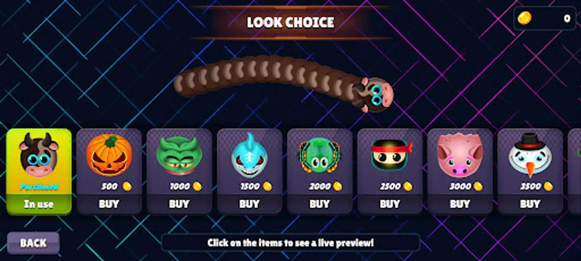 Customization: Choose a name for your snake and win games and collect coins to unlock different skins for your snake (pumpkin, cow, frog, alien, ninja, fish and more).