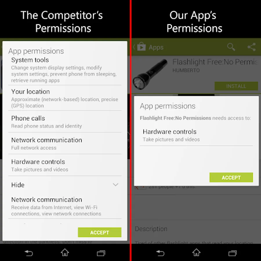 Tired of other flashlight apps that read your location, personal information, phone calls, and network activity etc?