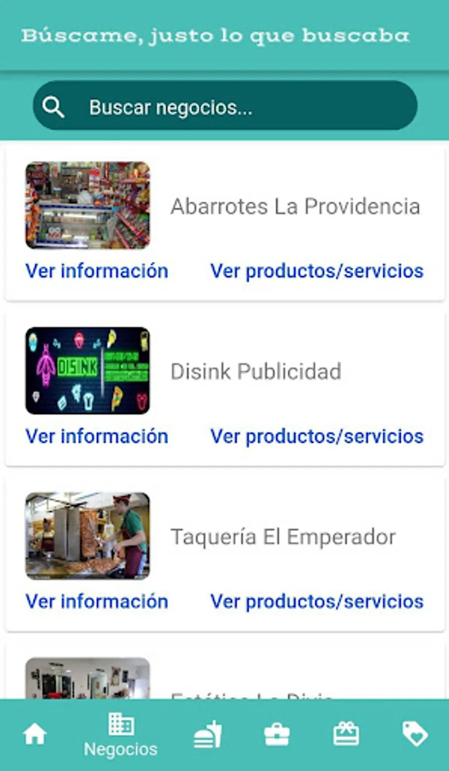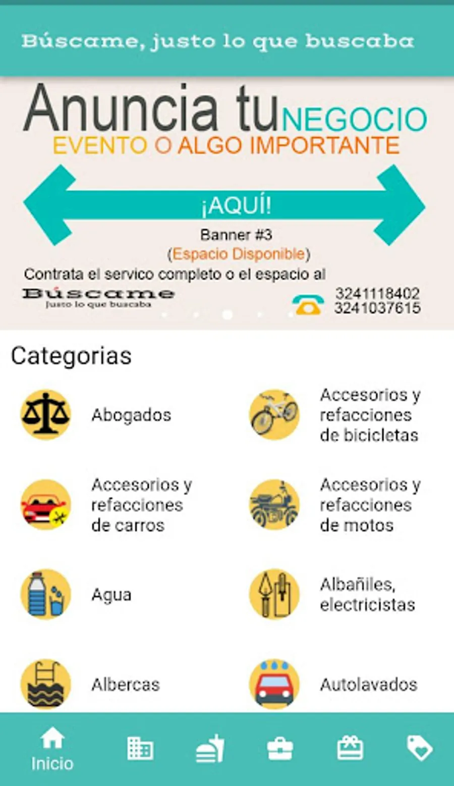 Buscame is a mobile application for Android version 4.1+, in which are the businesses (of ixtlán del río, Nayarit), contact information, location map, the products offered to the public, such as meals, beverages or articles. In the same way are the services and promotions offered by each of the businesses registered in the platform. They are categorized what makes them find them in a fast way, adding the menu they offer to the public, as well as the option to search in a general way for both businesses and what they offer by name.