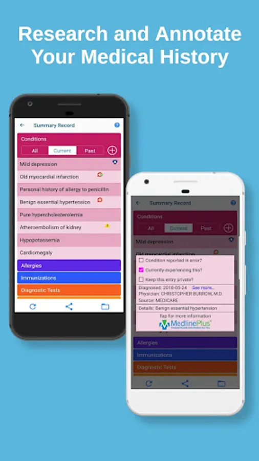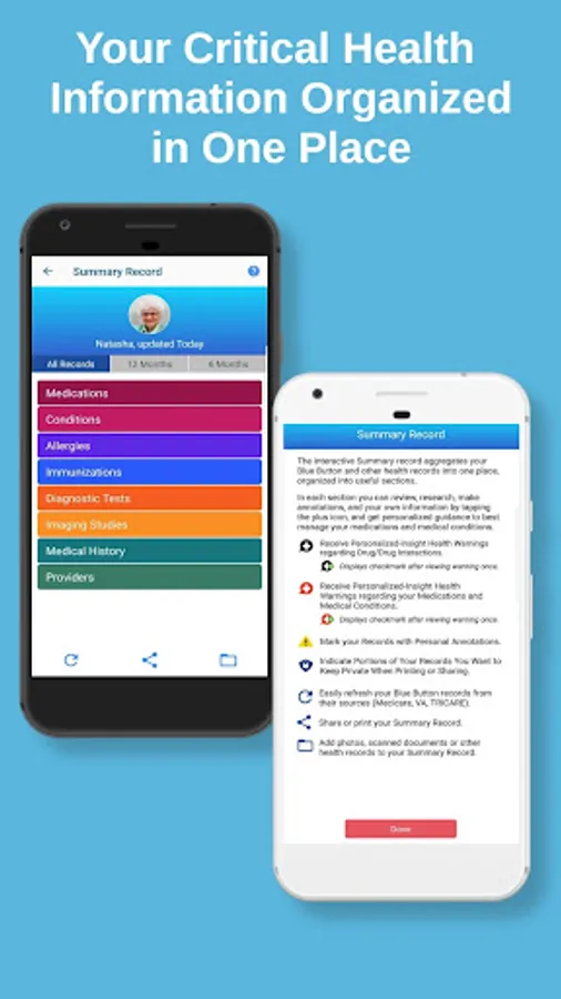 iBlueButton pulls and organizes multiple records into a single Summary Record, with all critical information in easy to view sections (medications, conditions, laboratory test results, etc.) and your detailed medical history (physician visits, hospitalizations, etc.). This Summary Record is available at all times to review, research, share, print and annotate critical health information. iBlueButton’s on device architecture fosters privacy and security and allows for data to be accessible even if you are not connected to the Internet.