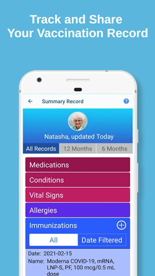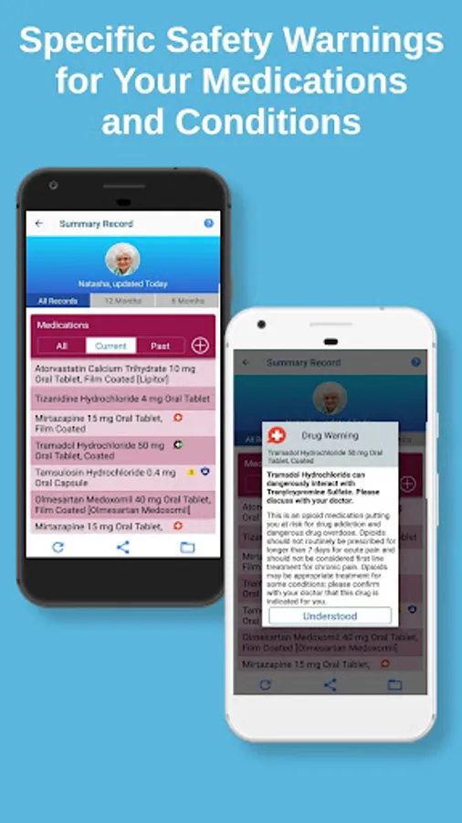 Whether it is about the medications you currently take, a new one recently prescribed, an existing condition, or new medical condition iBlueButton automatically generates safety warnings and best care practices based on well-established guidelines. iBlueButton now also offers COVID-19 related alerts, including an alert if you are at risk of severe COVID-19 infection, and an alert about eligibility to receive the COVID-19 vaccine.