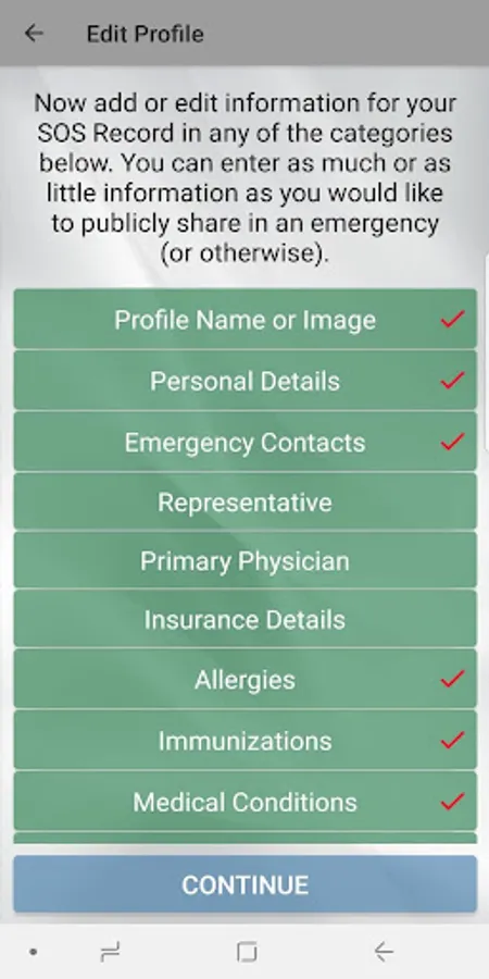 Emergency records include different categories-of-information for you to use as needed: Personal Details, Spoken Languages, Emergency Contacts, Allergies, Immunizations, Medical Conditions, Medications, Other Health Info, Implanted Devices, and Special Needs. Enter pertinent information in each category for your emergency record. You should include any vital information in an emergency situation like a life-threatening allergy, or any underlying chronic condition so that emergency medical personnel will know about it. It is important to fill out the Emergency Contacts section with the name and contact information of the person(s) you want to be directly alerted in case of an emergency.