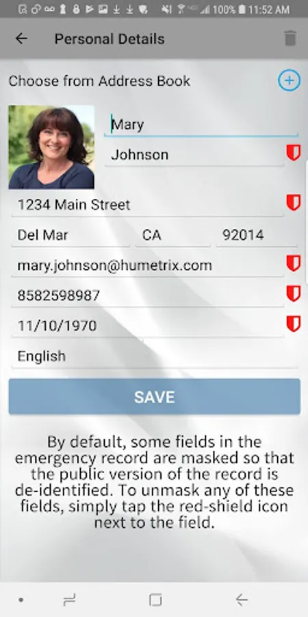 SOS QR allows you to create emergency records for multiple profiles, with easy entry of emergency medical and contact information. SOS QR creates two versions of the emergency record for each profile: (1) a private one accessed from the SOS QR app itself, for you to edit or share in person (e.g., in an emergency room), and which has all detailed information viewable; and (2) a public, de-identified online version published to a secure Humetrix SOS QR server so that it is available to emergency responders who scan the record’s QR code when you are incapacitated and cannot open your phone. By default, the public version of the emergency record is de-identified so that information such as Last Name or Date of Birth do not appear in the record.