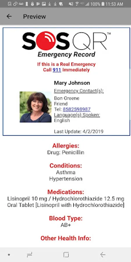 In an emergency, emergency personnel can scan the QR code with any QR code scanner to see your pertinent health information. When the QR code is scanned, SOS QR automatically sends an email to your listed contacts, with a map of the emergency location.