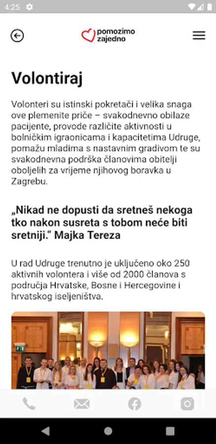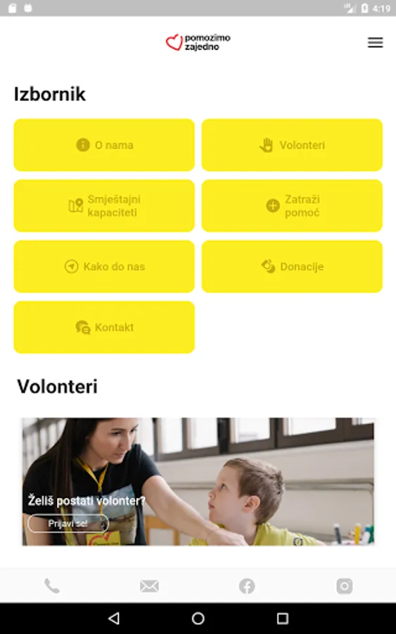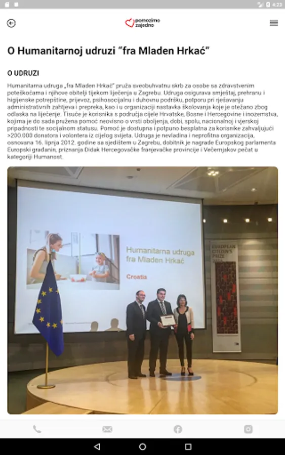 The mobile application "Let's help together" enables connecting people in crisis situations due to sudden and severe health problems with professionals who provide real-time counseling and support, so that patients and their family members receive professional support and advice to cope with the initial shock and stress. and administrative and organizational support when arriving for treatment in Zagreb, far from home. The application enables the provision of digital online services: counseling, psychological support, requesting a service from the service provider or at the user's home, assistance in organizing life during treatment away from home, in Zagreb or abroad. The application offers counseling and support via message, telephone as well as the possibility of requesting to receive the service live in the facilities of the humanitarian association "Fr. Mladen Hrkać" or in the user's own home. Within the application itself, data on users and on the course of their treatment and recovery are recorded, which will enable professionals to monitor the psychophysical condition of the sick person and family members. This ensures the preparation of a quality individual approach in providing support. In addition, one of the functions of the application is to collect feedback on the quality of service. The service users themselves can give their suggestions for improving the services and thus the quality of services. A sense of security is a very important and key segment in the most difficult moments of their lives - when they find out that they or one of their family members is suffering from a serious illness and that the patient is forced to seek treatment away from home. Through the application, it is possible to get all the information and interactively get acquainted with everything that awaits treatment far from home, as well as all kinds of services that the humanitarian association "Fr. Mladen Hrkać" can provide. Thanks to technology and applications, the impression left on users evokes security and faith in a positive outcome. In real time, users can send a contact and a message to professional associates in the Association who will resolve all their doubts, concerns and help them organize treatment away from home. In addition to support in the first moments, the interaction through the app takes place throughout the treatment stay away from home. In addition to providing digital social services to members of vulnerable groups, the mobile application improves information and communication relations with volunteers, social welfare institutions and other institutions, related civil society organizations, donors, the media and the general public. All of them contribute to building a society that is aware of the social risks of seriously ill people and people with disabilities, and in addition they are educated on ways to provide support to such people with the aim of easier integration into the community. The application allows the registration of all interested persons who want to volunteer. In just a few steps it allows them to become part of our large volunteer family. Donors provide funds for work and the provision of social services. Without donor support we would not be able to provide all the services and help so many people. Through the application, donation data and ways to help donors from around the world are available. Professional support through the mobile application is provided by employees and associates of the humanitarian association "Fr. Mladen Hrkać", a social worker, psychologist, psychiatrist and pedagogue. Digital online support is of particular importance for people in rural, assisted and island areas whose access to social services and support is limited due to disadvantaged geographical and economic location. The development of the mobile application "Let's Help Together" was co-financed by the Ministry of Demography, Family, Youth and social policy through the project "Mobile application for help and support in coping with illness" as part of the Tender for the award of one-time financial support for 2019.