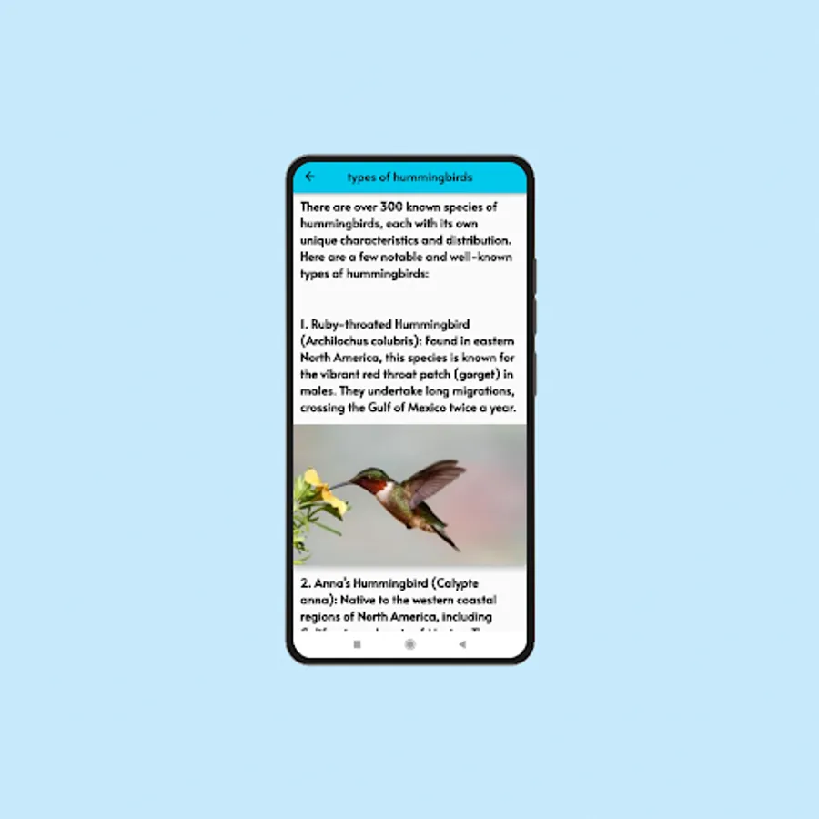 Hummingbirds is an innovative and comprehensive mobile application designed for nature enthusiasts, birdwatchers, and anyone fascinated by the mesmerizing world of these tiny, vibrant creatures. With Hummingbirds, you can dive into a wealth of information and interactive features centered around these magnificent birds. Whether you're a beginner or an experienced bird enthusiast, this app will serve as your go-to resource for all things hummingbirds.