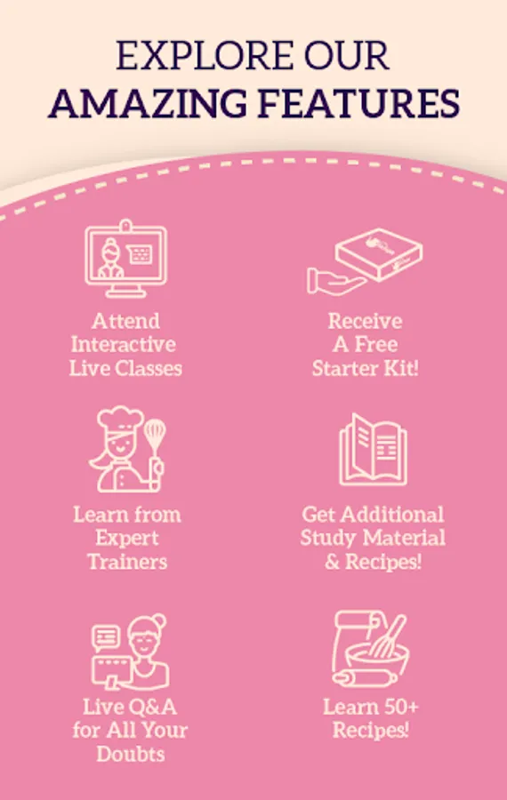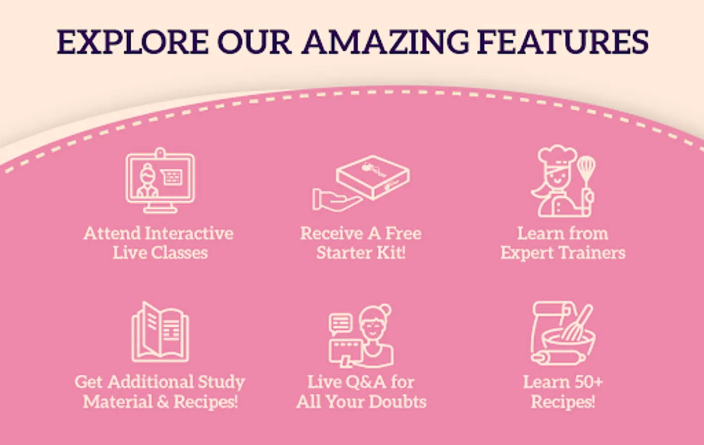 The baking course of Hunar Online teaches you to bake different varieties of cake like Classic Cakes, Eggless Cakes, Special Diet Cakes and much more! There are 50+ cake recipes in this course. You’ll learn each course through a live session. After enrolling in this course you will receive a free starter kit with all the study materials which are essential to get started.