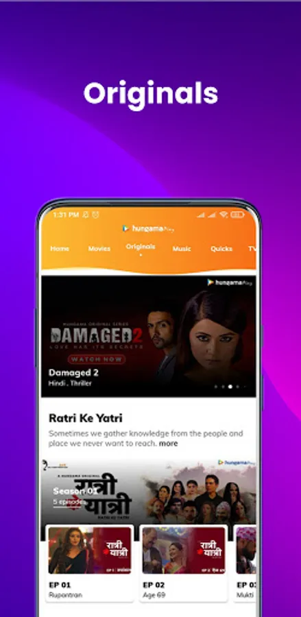 Hungama Originals - Brand new stories for a brave new world. Bar Code (Hindi), Damaged (Hindi), Hankaar (Hindi), Padded Ki Pushup (Hindi & Marathi), Shree Kaamdev Prasanna (Hindi & Marathi)and more are ground breaking shows across different genres featuring unique storylines and great star cast..
