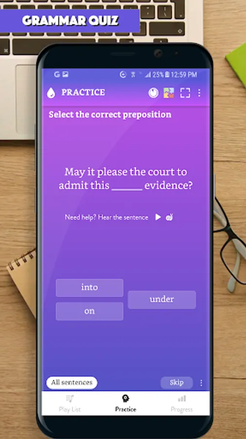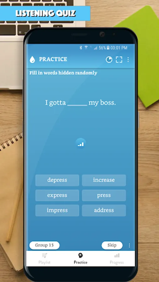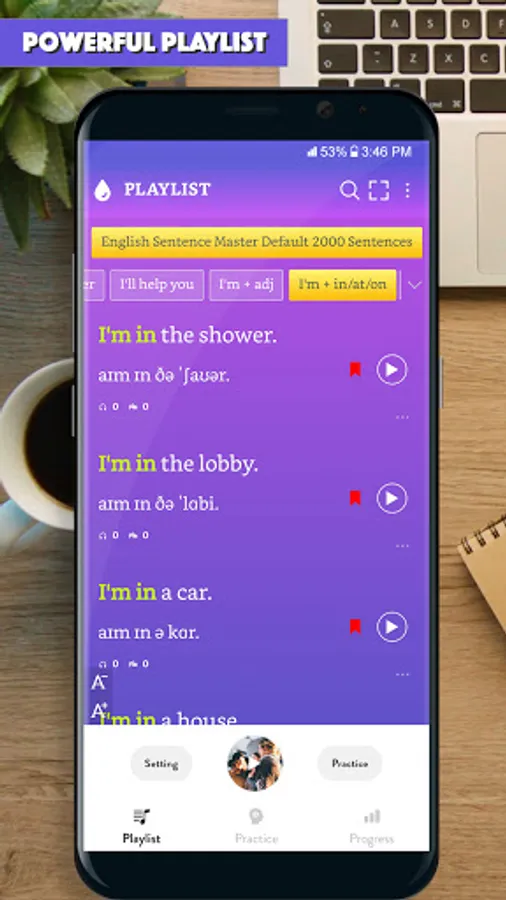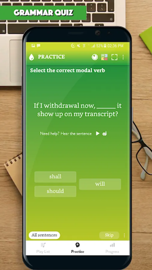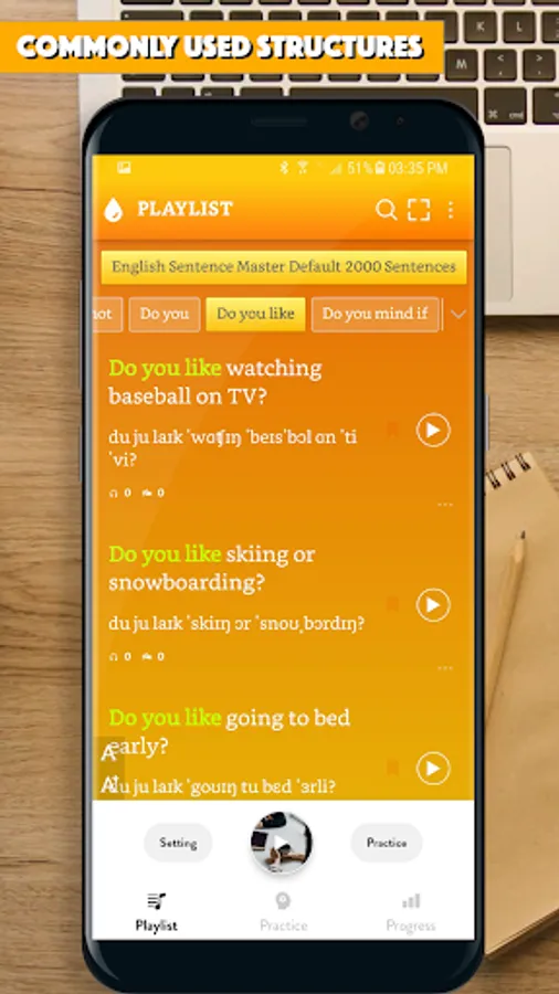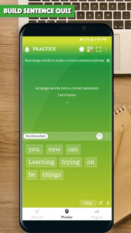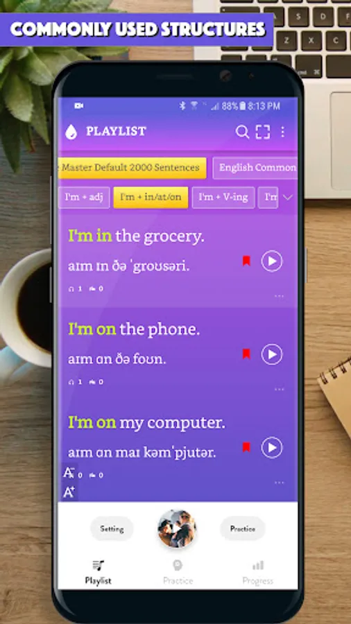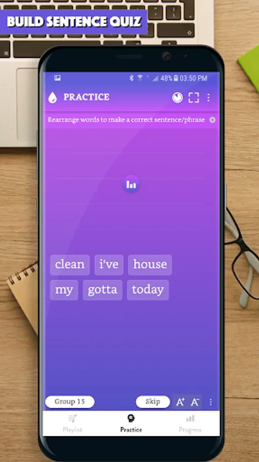 All the app's features are designed to help you learn to make English sentences and improve the main skills: Listening to a sentence, writing (making) a sentence correctly, speaking a sentence/a phrase correctly.