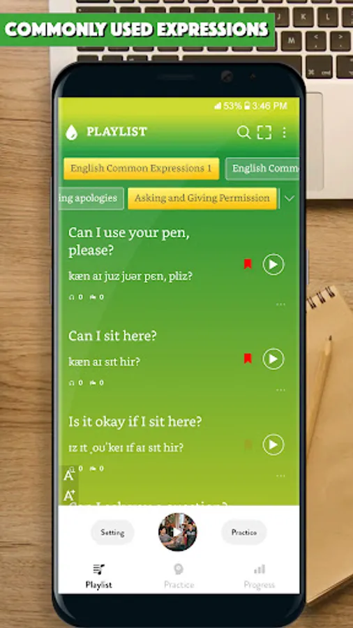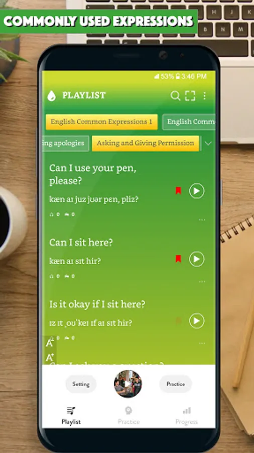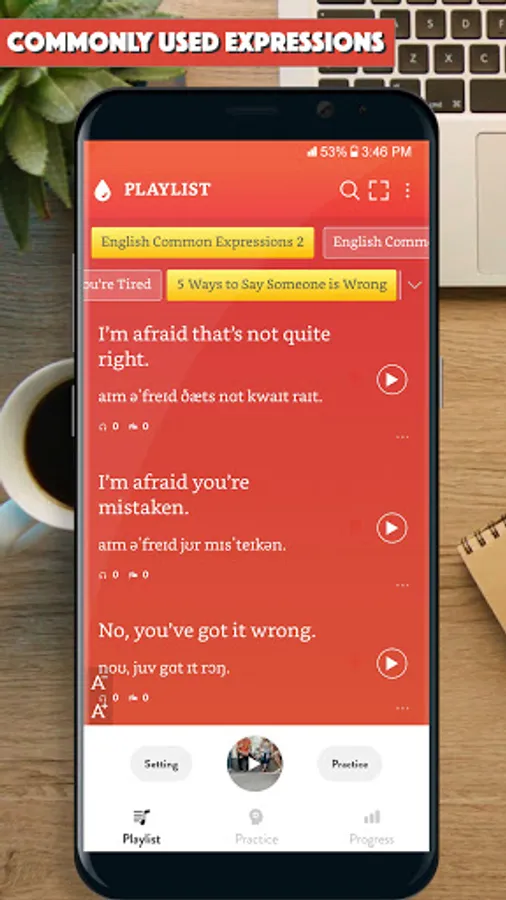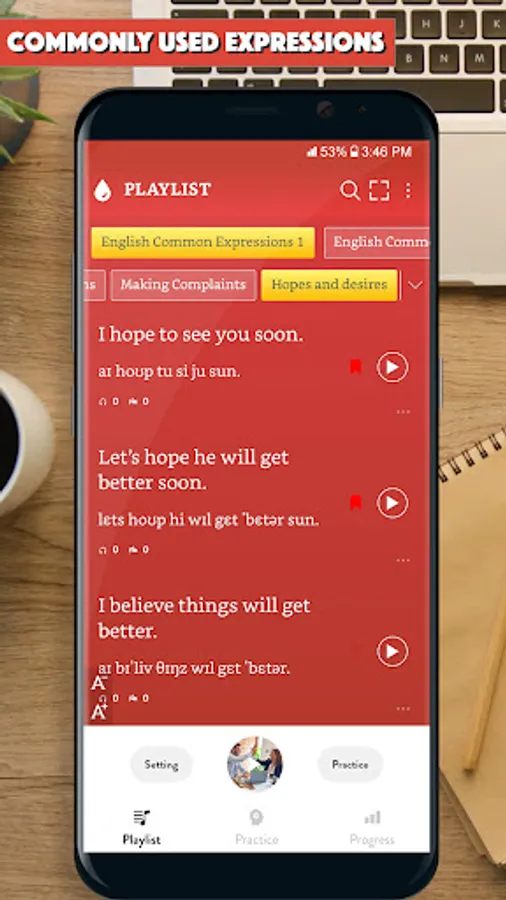 The app is designed with a question in mind - How to help users quickly open the lesson and no need to constantly keep the app open. Just tap the Play button and exit the app, turn off the screen, and focus on listening. So it is very useful for you to learn when you are driving.