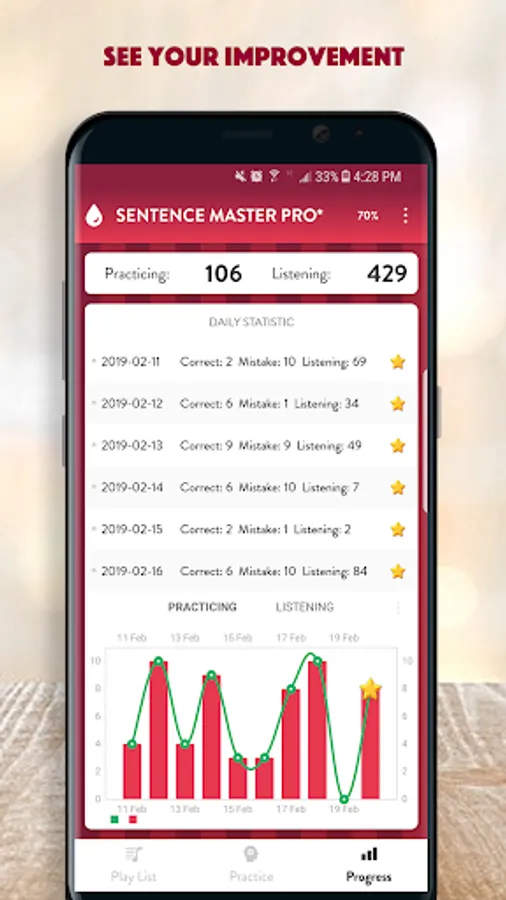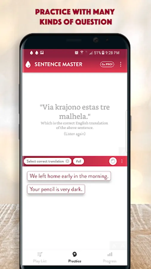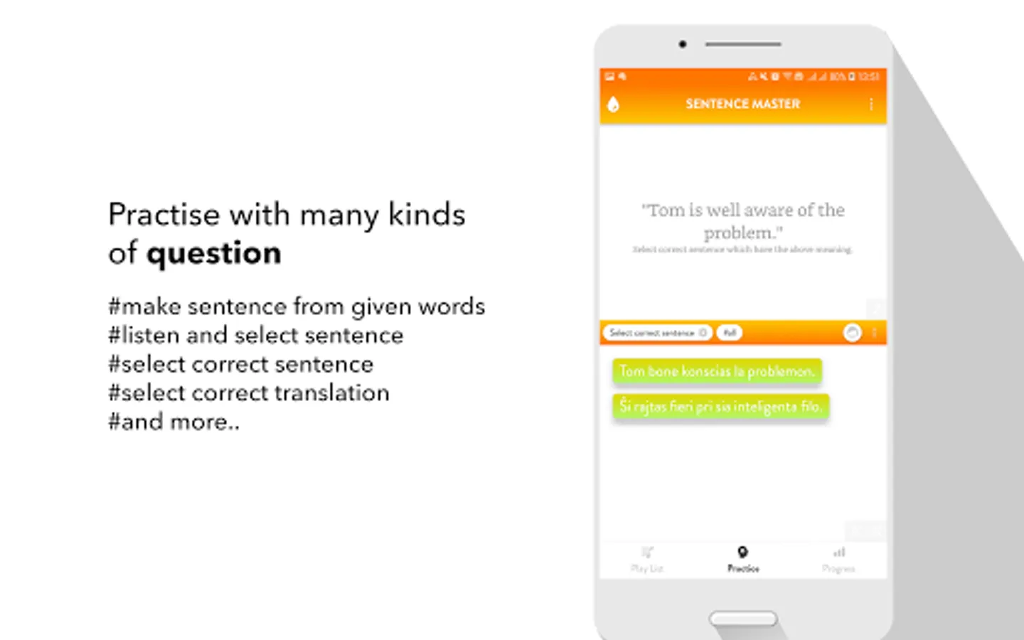 All the app's features are designed to help you learn to make Esperanto sentence and improve the main skills: Listening to a sentence, writing (making) a sentence correctly, speaking a sentence/a phrase correctly.