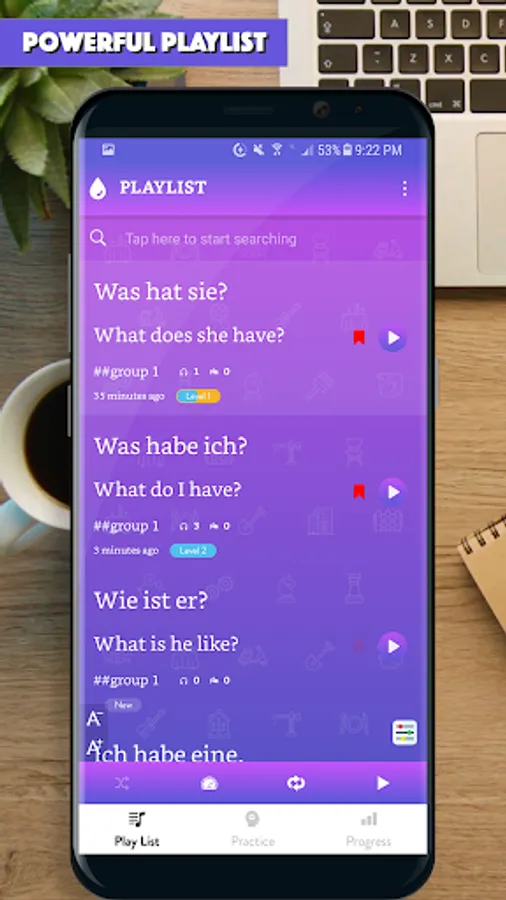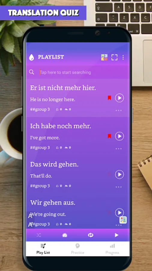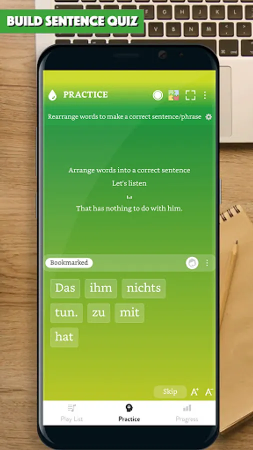 All the app's features are designed to help you learn to make German sentences and improve the main skills: Listening to a sentence, writing (making) a sentence correctly, speaking a sentence/a phrase correctly.
