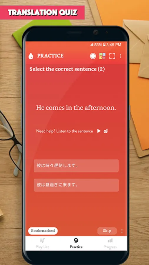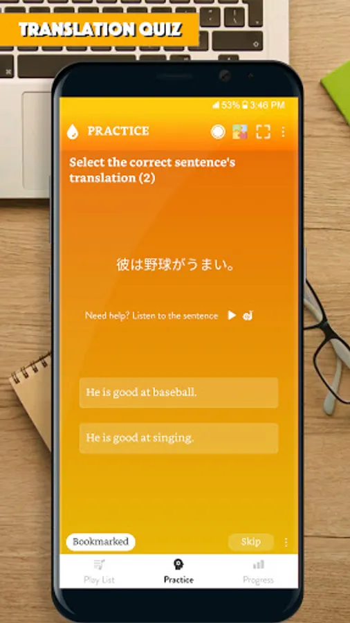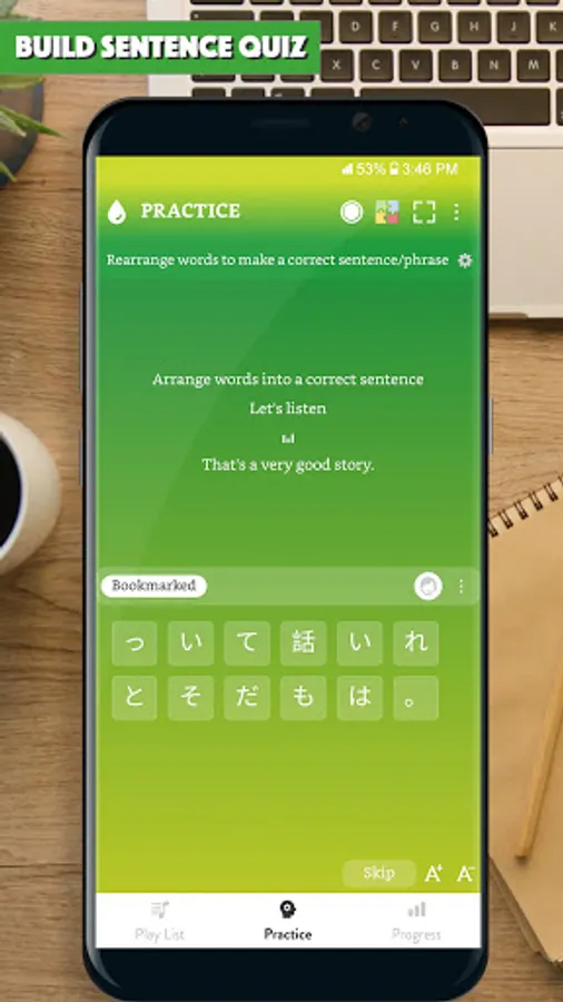All the app's features are designed to help you learn to make Japanese sentence and improve the main skills: Listening to a sentence, writing (making) a sentence correctly, speaking a sentence/a phrase correctly.