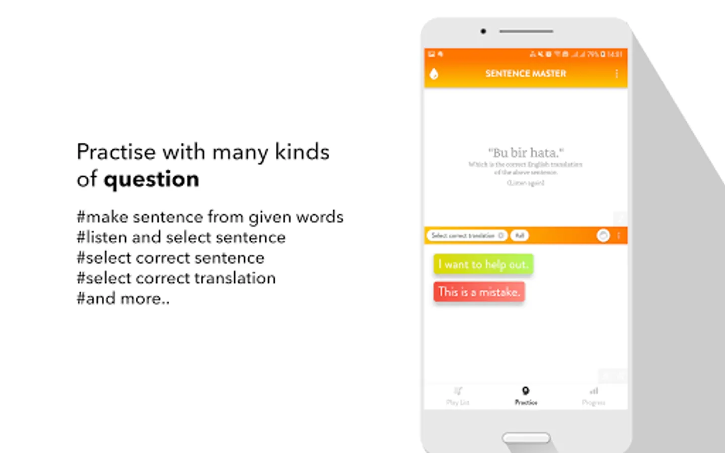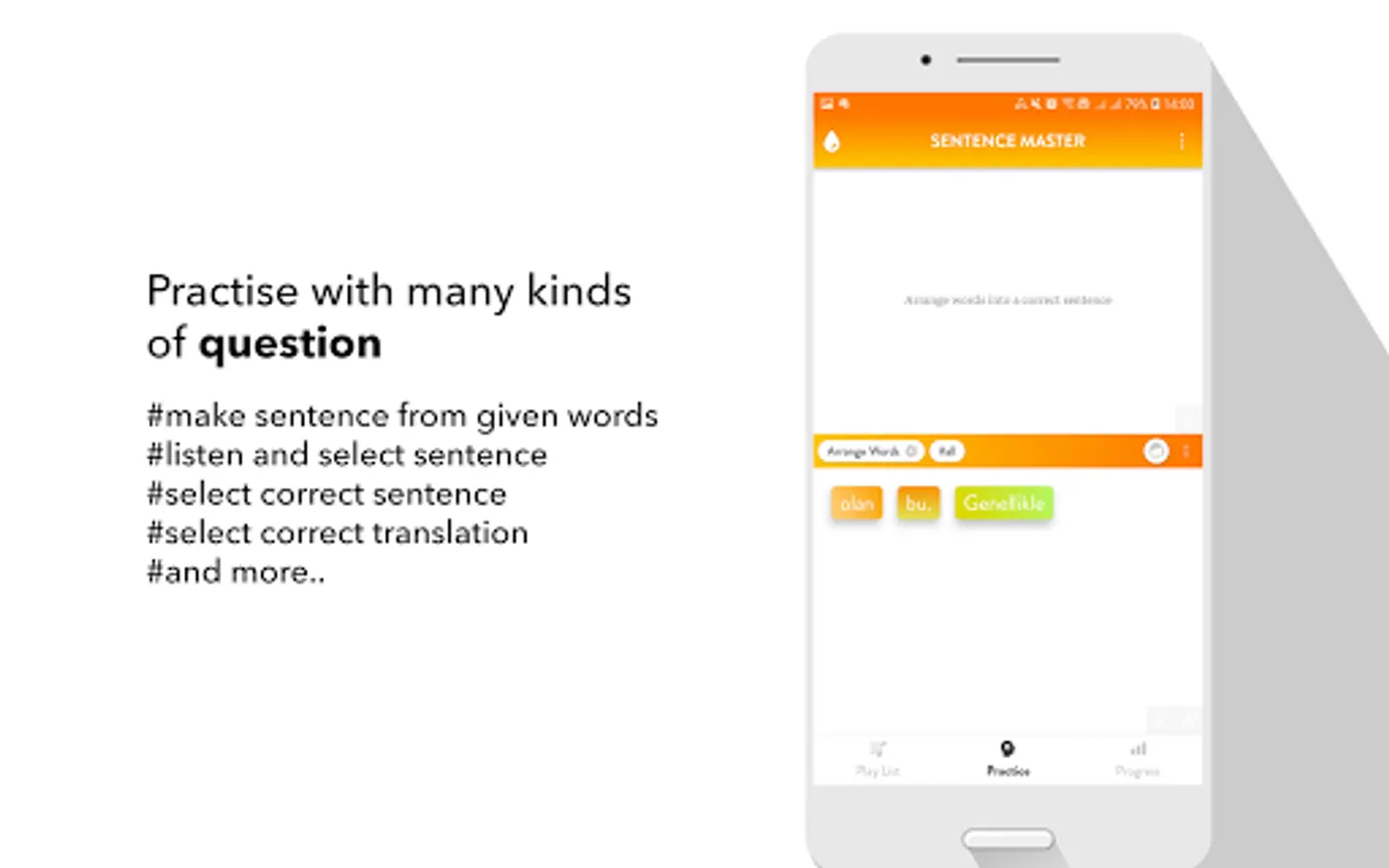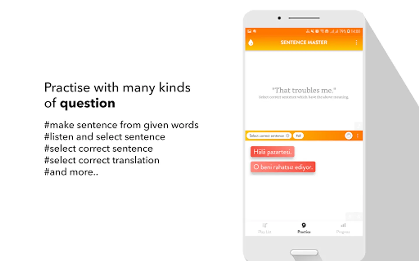 All the app's features are designed to help you learn to make Turkish sentence and improve the main skills: Listening to a sentence, writing (making) a sentence correctly, speaking a sentence/a phrase correctly.