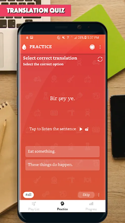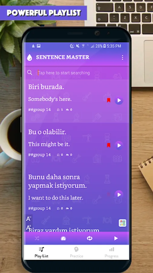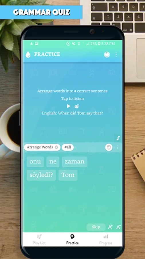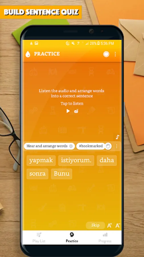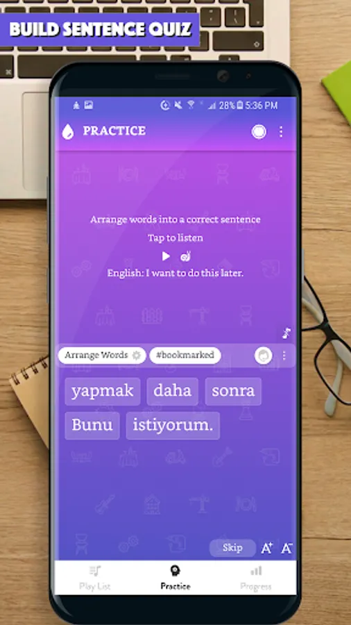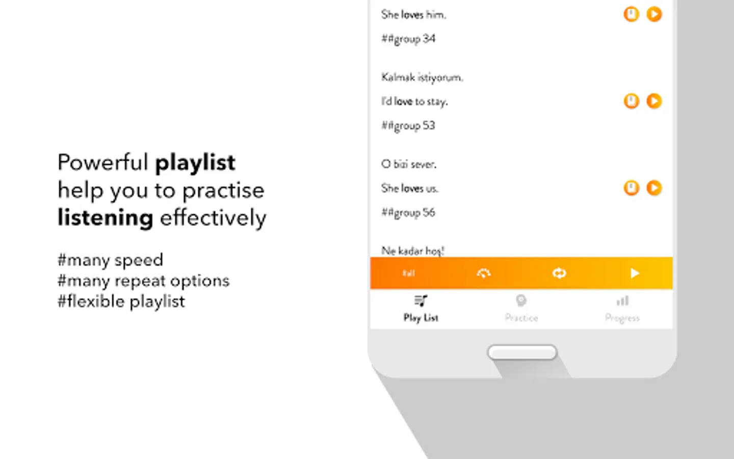 All the app's features are designed to help you learn to make Turkish sentence and improve the main skills: Listening to a sentence, writing (making) a sentence correctly, speaking a sentence/a phrase correctly.