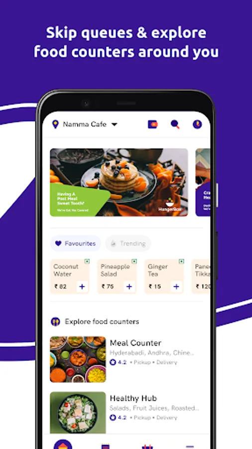 Facing problems carrying cash/tendering the exact change? No worries! HungerBox enables you to pay for food via UPI, credit/debit cards, Net Banking, digital wallets and more.