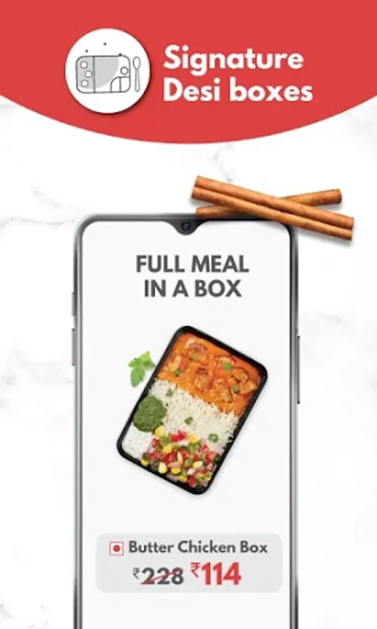 You can order online on the App from a wide range of hand-picked meal options including All-in-one meals, Curries, Desi Box, Dum Biryani, Wraps, Desserts, Desi Openers & more. The Desi Boxes are a fusion of flavors and a full meal in an easy-to-carry box, while the All-in-one meal is our take on the Authentic Royal Thali.