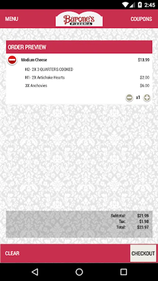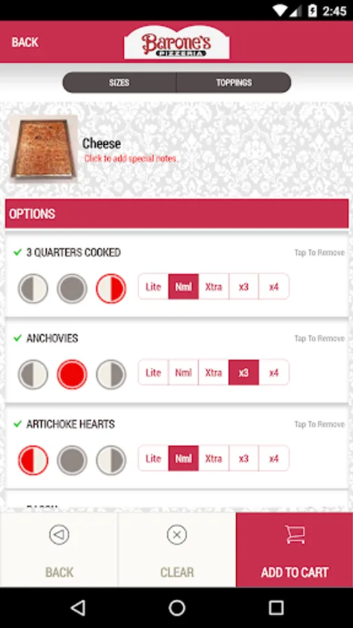 Whether you are having a party for the big game, a mid afternoon snack or just picking up dinner think of Barone's Pizzeria! We offer gourmet pizzas made from the healthiest ingredients and dough made from the finest flour available, fresh salads, hearty pastas, hot sandwiches and delicious deserts that will finish any meal.