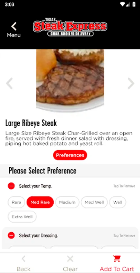 At Texas Steak Express, our menu includes a wide variety of delicious choices from rib-eye steaks, steak tips, chicken breast fillets, cheeseburgers, sandwiches, salads, salmon to shrimp cooked to your specifications. All of our entrees come with a crisp salad, piping hot baked potato with all the trimmings, and a baked roll.