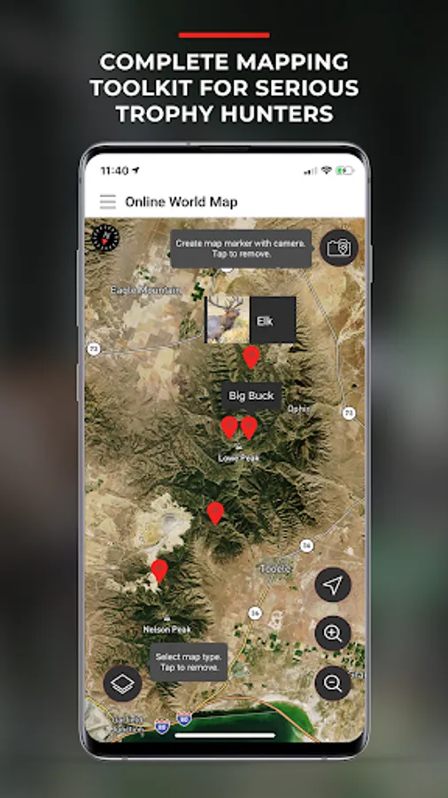 Locate your trophy - Have you bagged your trophy? Find it easily by taking a picture of its location. In addition to the maps and marking tools, you can also use photos to navigate to your trophy destination without any hassles! Hunting gps feature