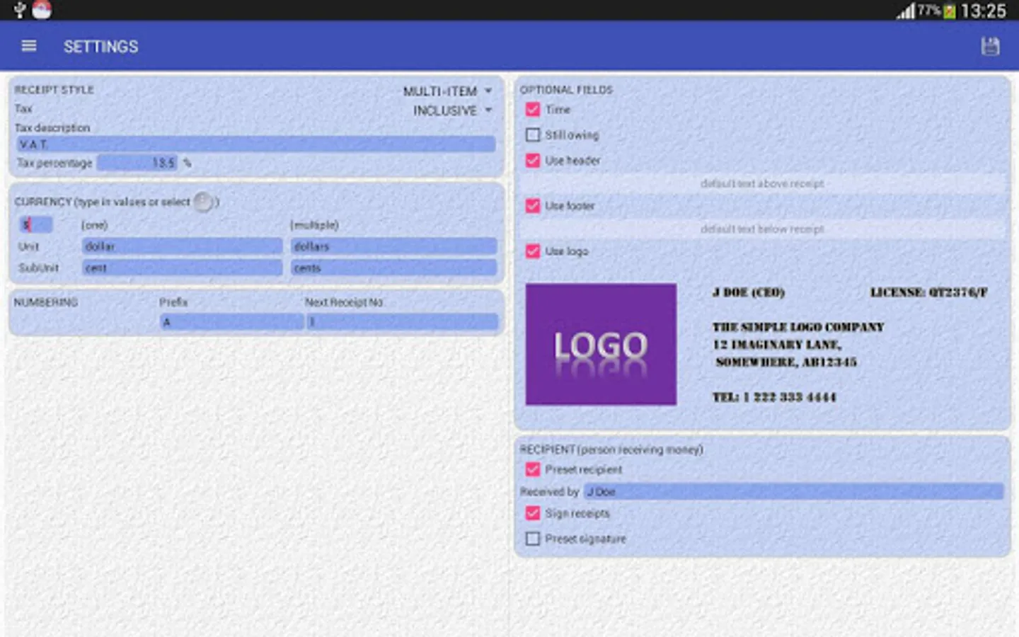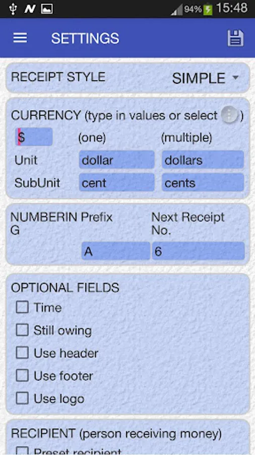■ Use preset recipient or enter recipient for each receipt