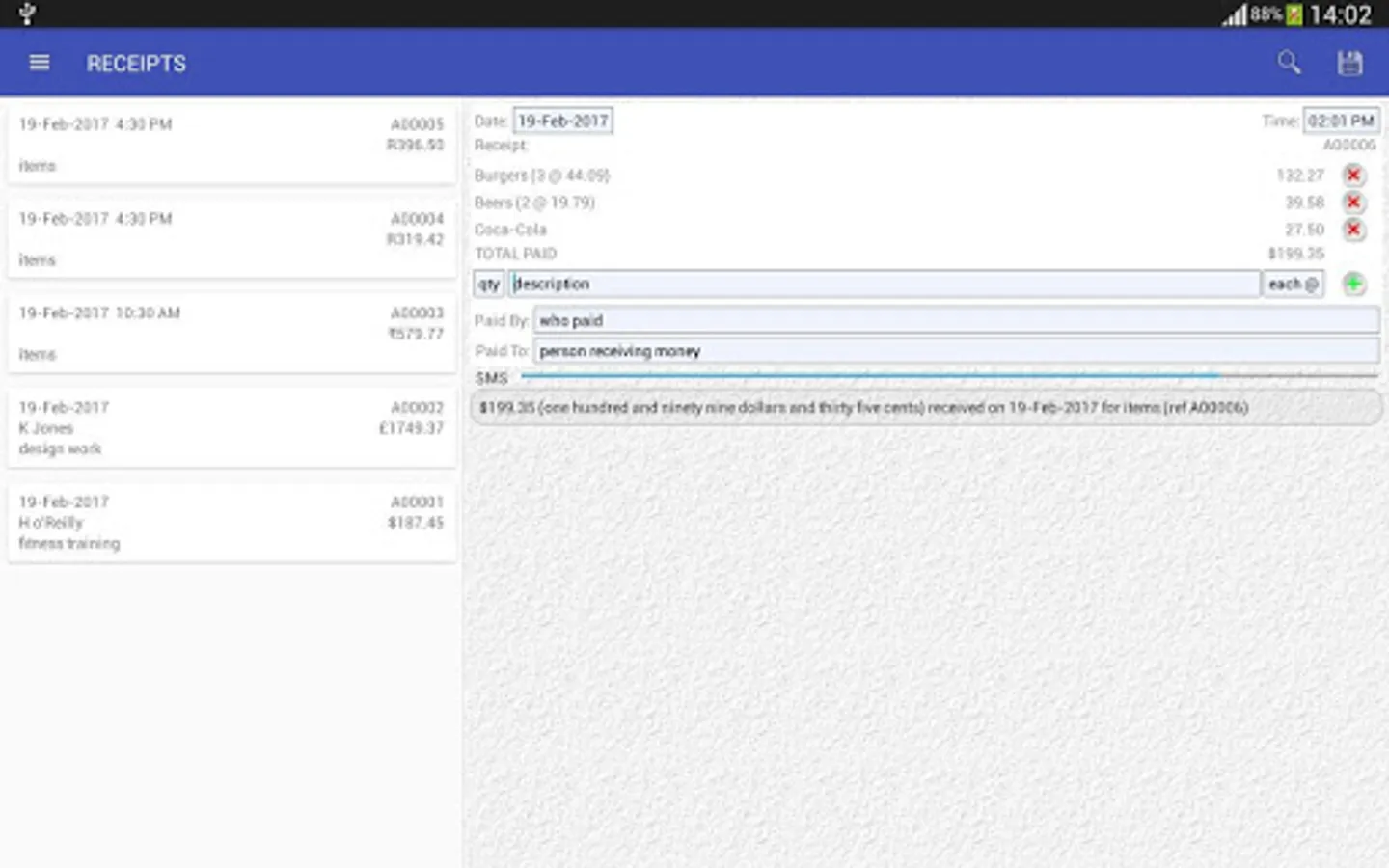As you save receipts, the descriptions typed in the "Received for", "Received from" and item description field are added into searchable lists for later use.