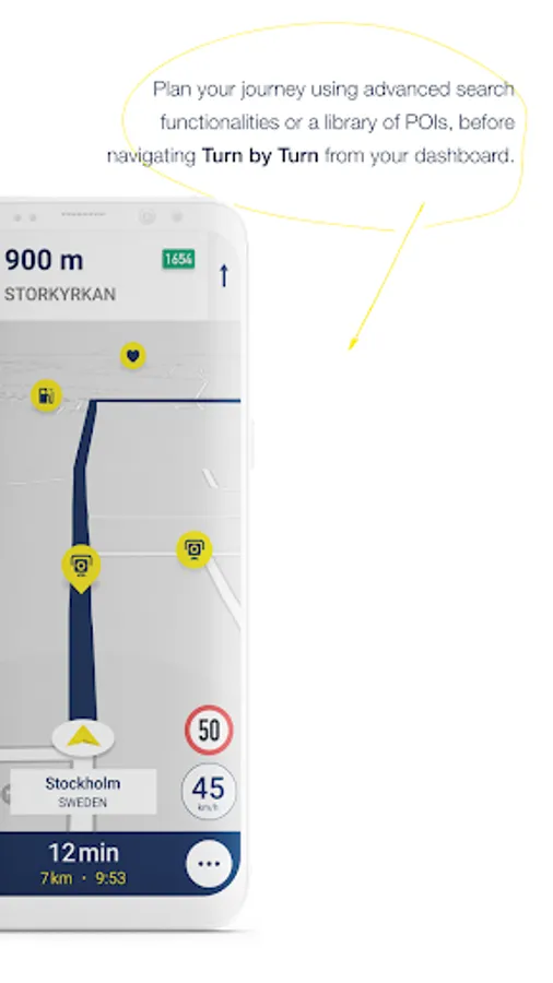 • Add POIs such as gas stations, restaurants, resting stops as waypoints or get notified when you approach them
