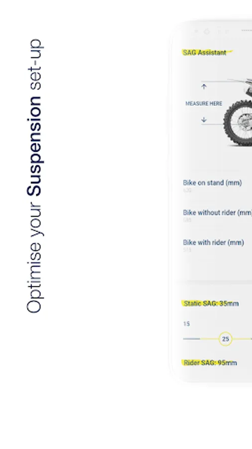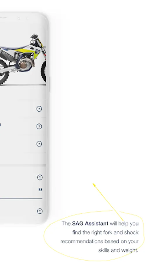 • The Suspension feature recommends suspension settings based on skill level and track conditions but also assists the rider in evaluating and setting the correct suspension SAG.