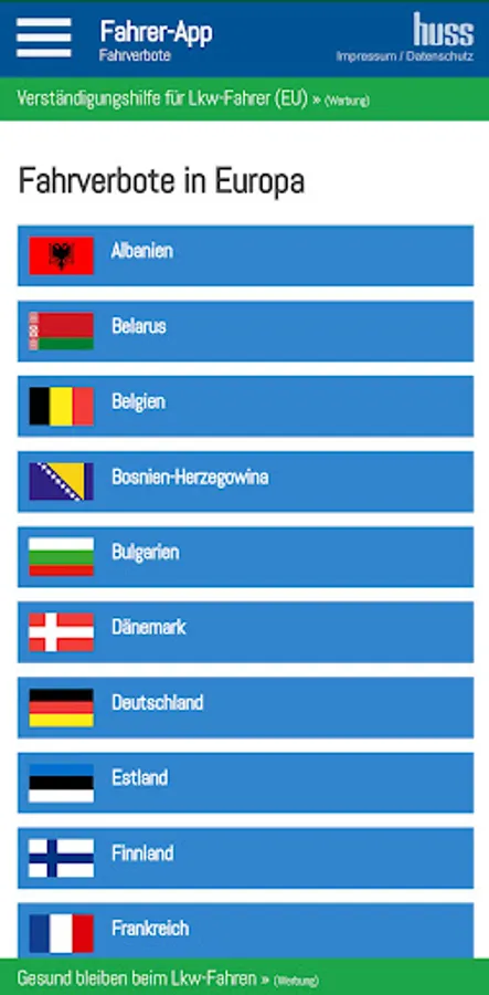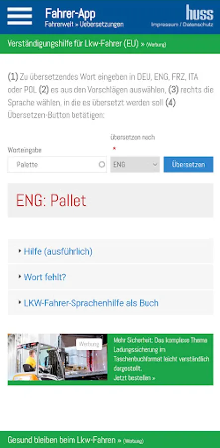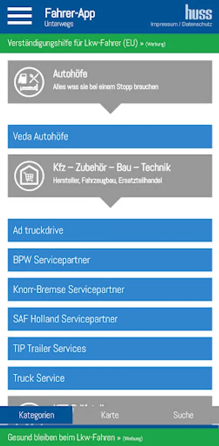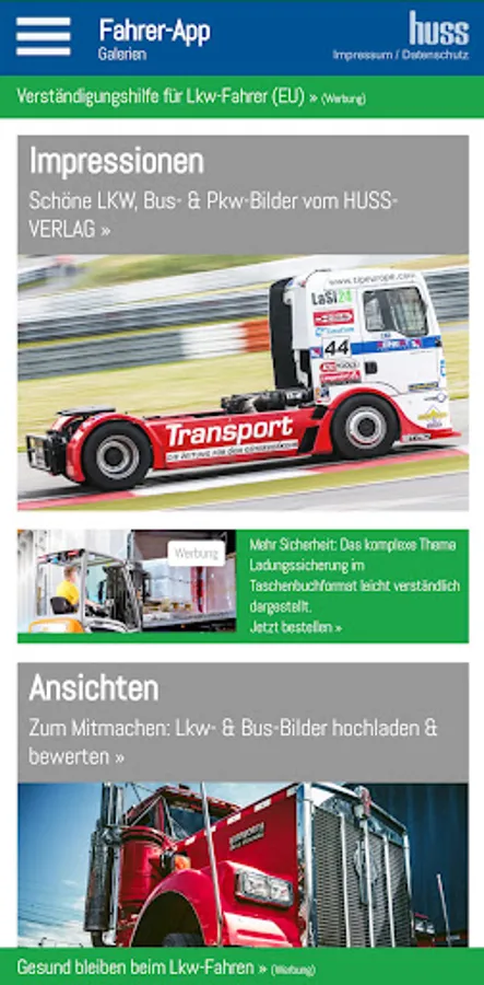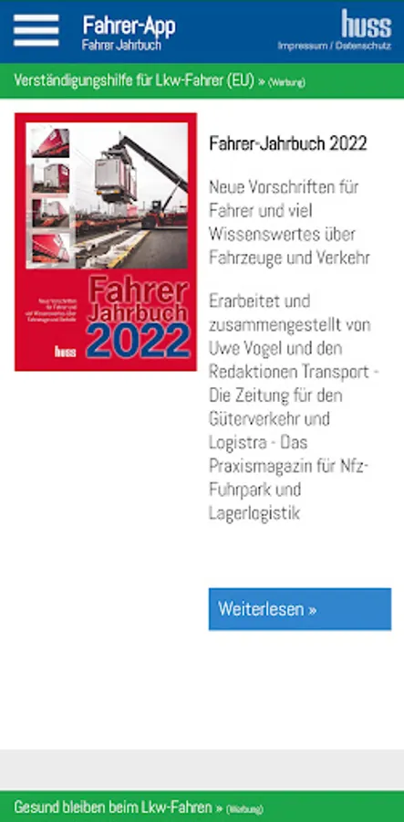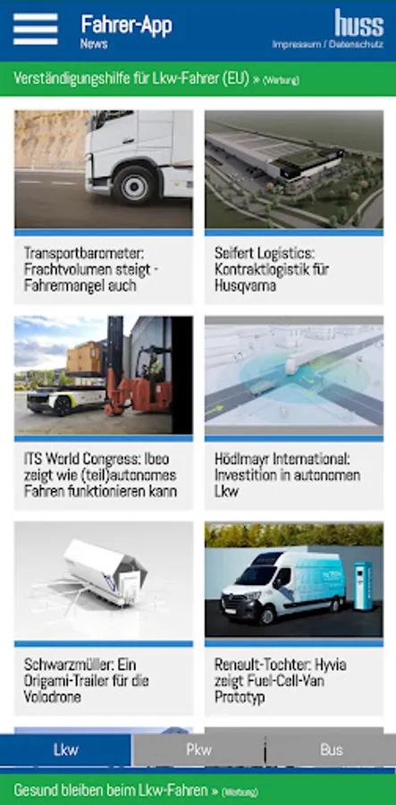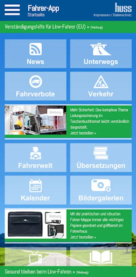 The HUSS-VERLAGS driver app was developed as a web app with the completely new relaunch in November 2021 to provide professional drivers with a range of interactive helpers that can make the everyday work of truck and bus drivers much easier. Car drivers can also find important information.