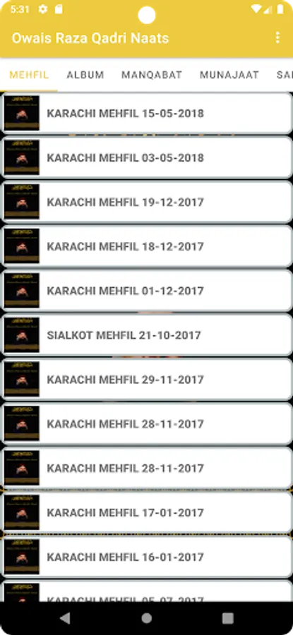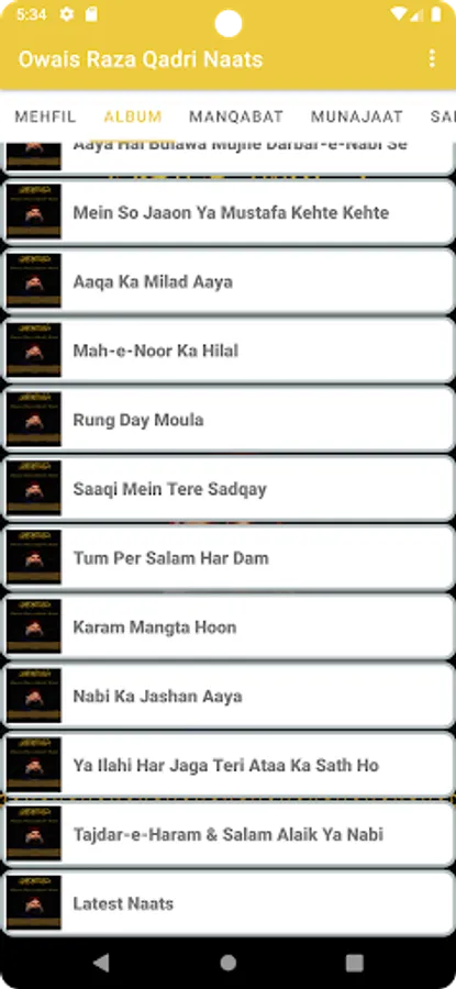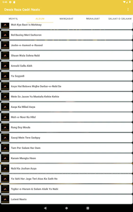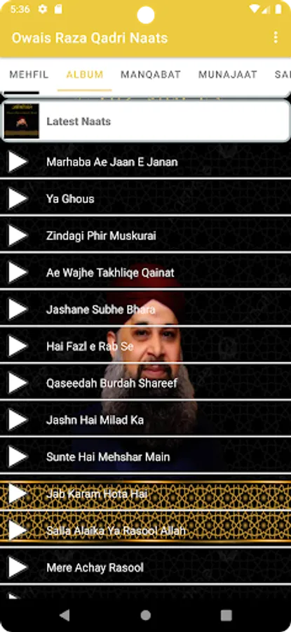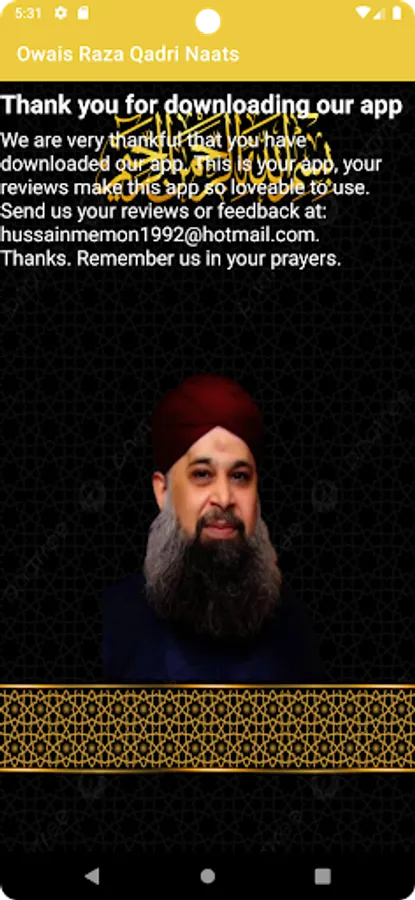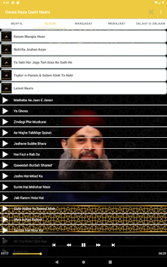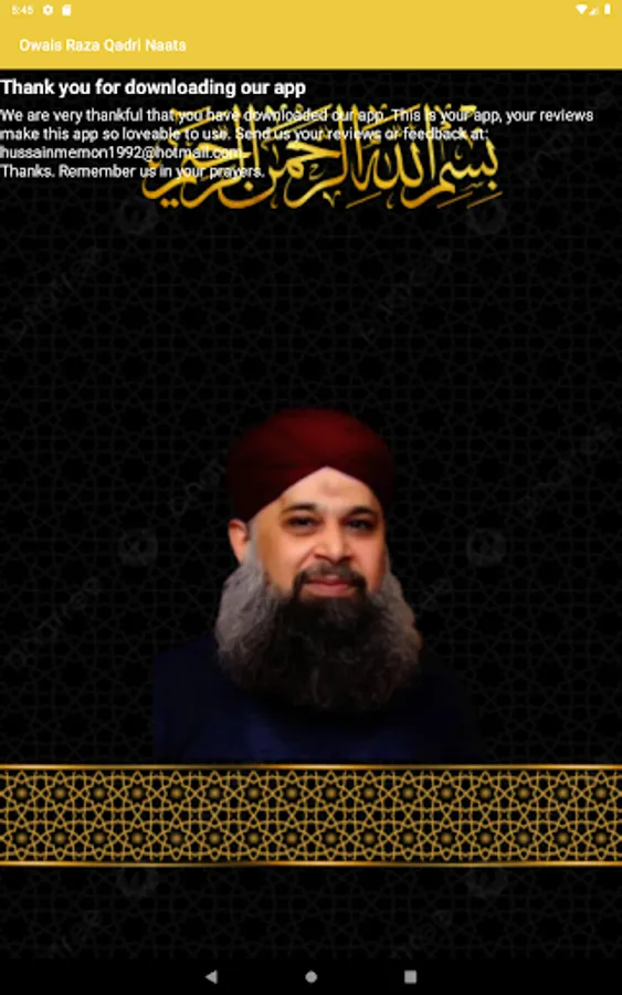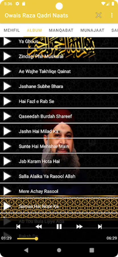 Media player of Owais Raza Qadri Naat. Now you can listen Owais Raza Qadri naat online at any time and at any place. This app contains naats recite by Owais Raza Qadri in his mehfils and albums. Here you can get naatain by Owais Raza Qadri Sahab in mehfils. You can listen naat shareef in all albums read in beautiful voice of Awais Raza Qadri. All the available naat is in mp3. This app also contain new album 2015. This app also have complete naat list related to album. We have included all naats in this app. Owais Raza Qadri naats free download are available. This app provides you owais raza qadri naat free. Listen and Download best naats of Awais raza qadri.You can also share naats with your friends via social apps. Please rate us if you liked our apps this is really important for us.