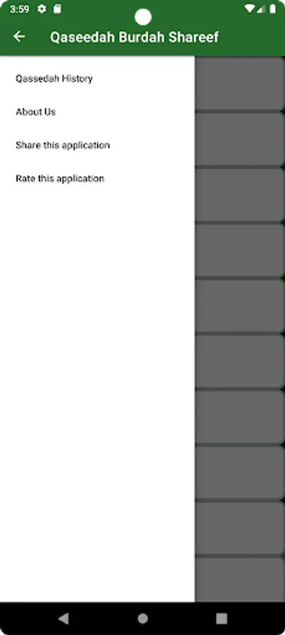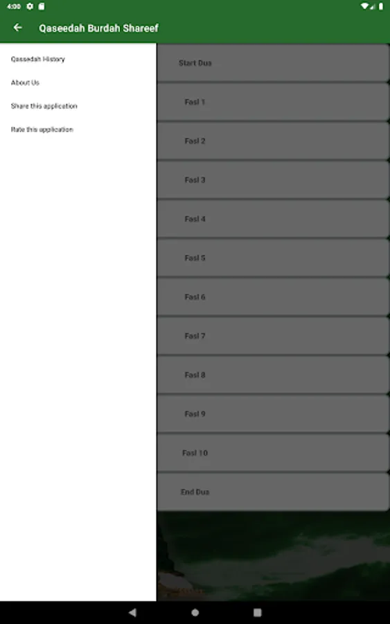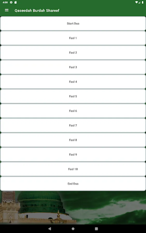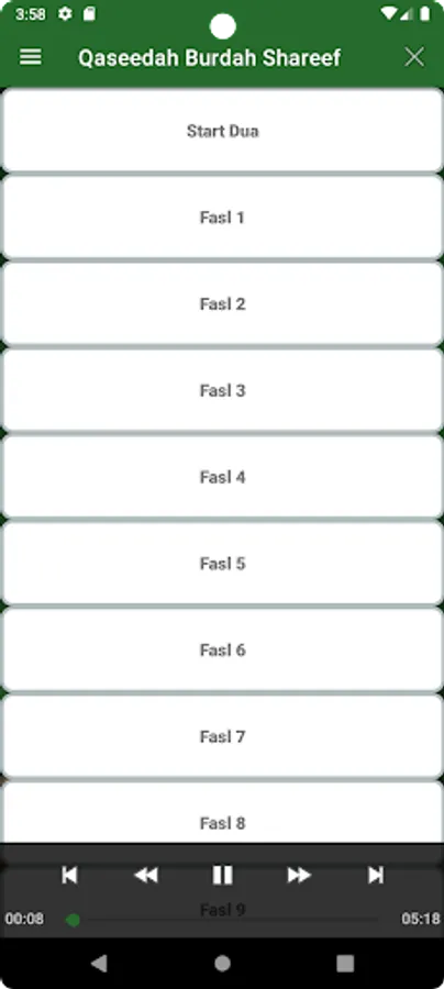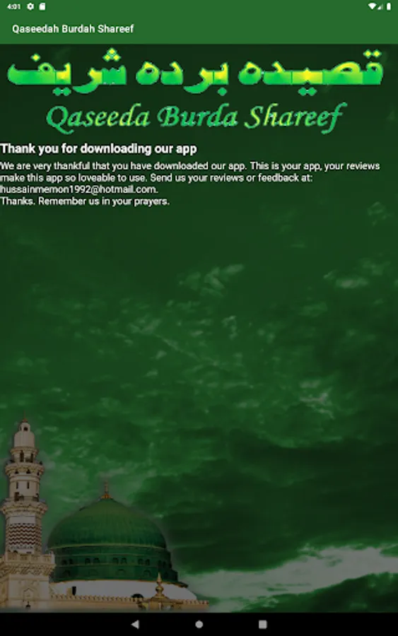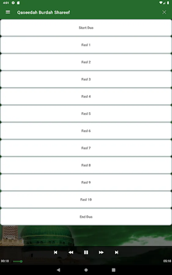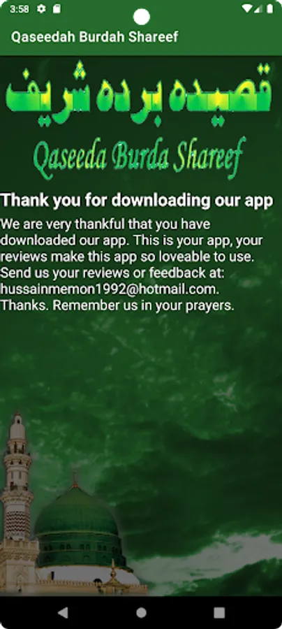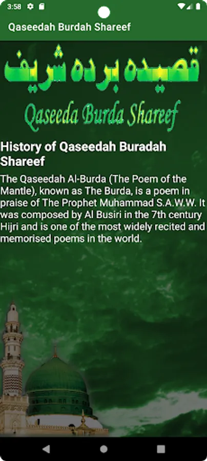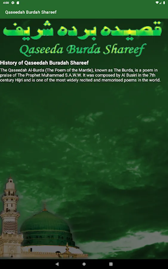 Qaseedah Burdah Shareef well knoew as Well known as "THE POEM OF THE SCARF". Qaseedah Burah Shareef is the arabic naat written by Sharfuddin Abi Abdullah Mohammed bin Sa'eed al-Misree, was well known by his surname Busaree from Bushire in respect of Hazrat Muhammad. Qassedah Burdah Shareef each line with urdu letter 'م'. The qasseda burda shareef is in mp3. The whole qasseda burda shareef is in urdu language. This app consists of audio version of all fasl with start and end dua. Do listen this and remober in your prayers.