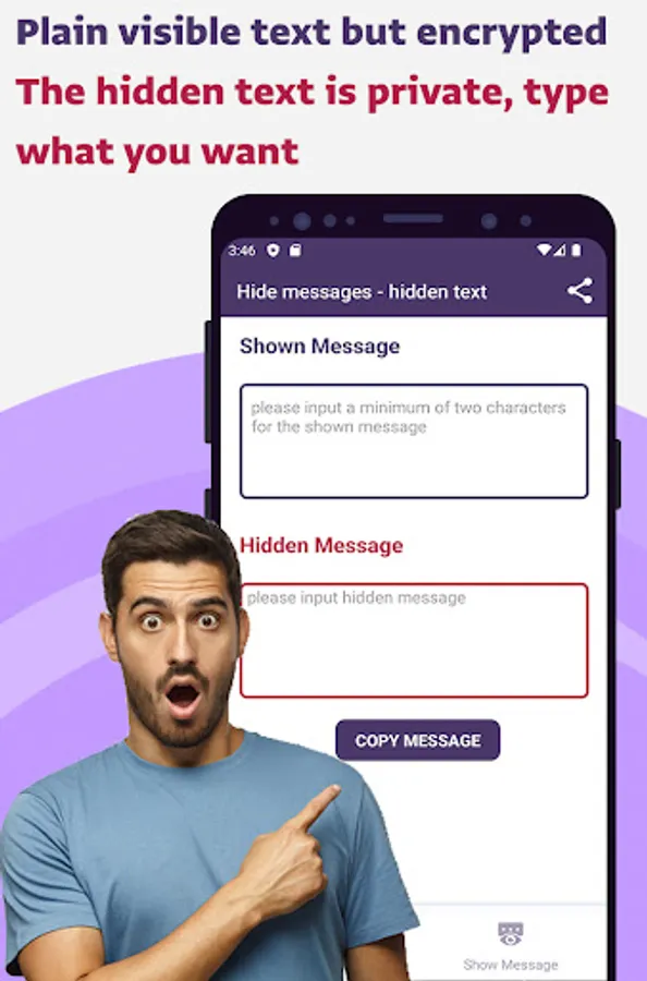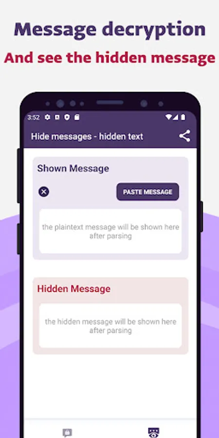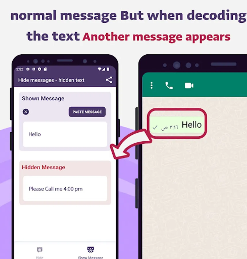 Hide messages - using this application, you can send a text, but when decrypting this text, it is a completely different text - for example, the displayed message is (Peace be upon you), but when decrypted by the application, the hidden message appears, for example (Do not contact me now, I am busy at work) and so you can Encrypt messages so that visible text and hidden text appear in the application only