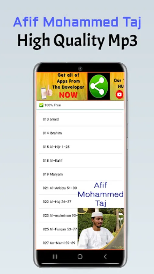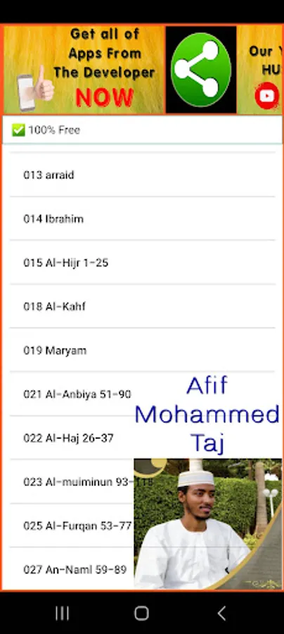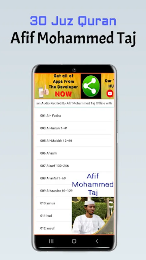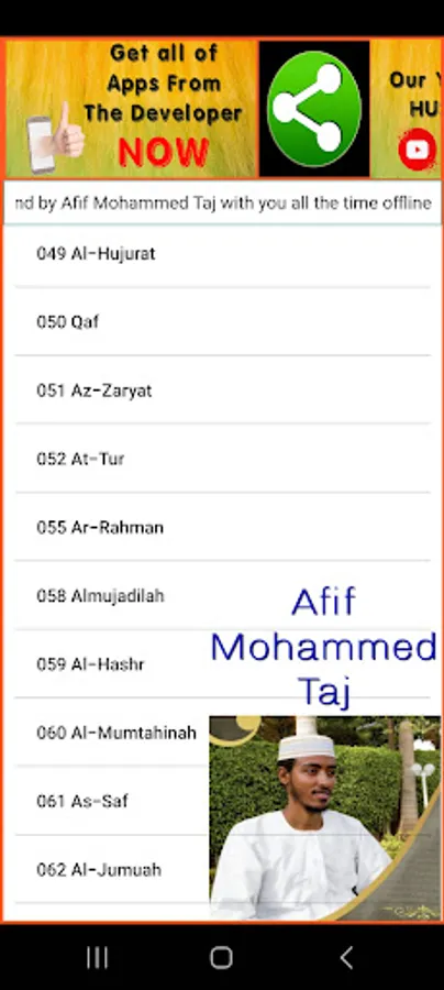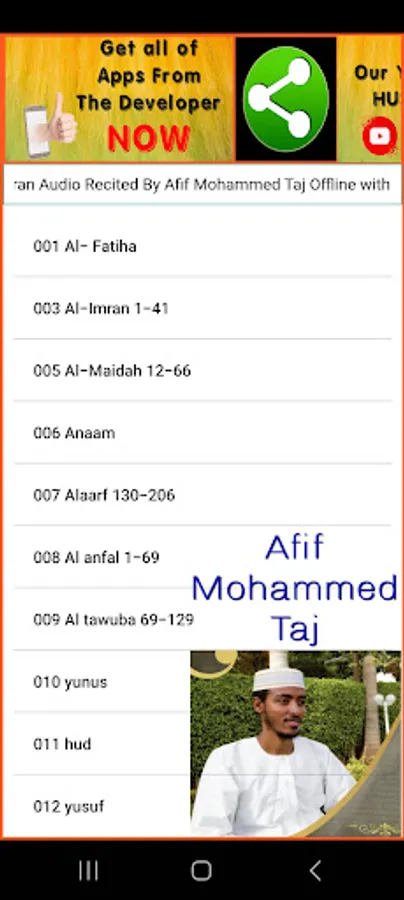 This is a Free Afif Mohammed Taj Holy Quran App. With this App, you can listen to your Quran recited by Sheikh Afif Mohammed Taj devided Surah by Surah. And also include Holy Quran Pages in Arabic for you to read. Download this free app and you can have the Holy Quran Arabic with sound by Afif Mohammed Taj with you all the time offline in your pocket.