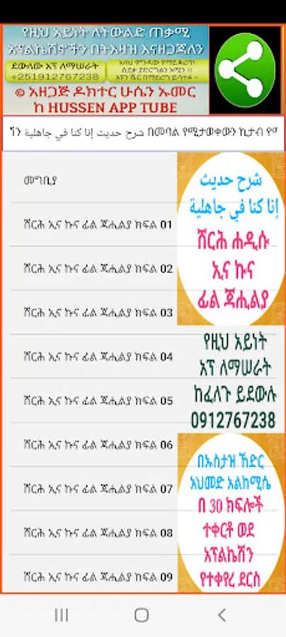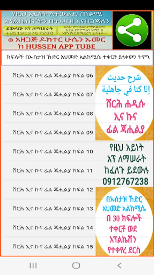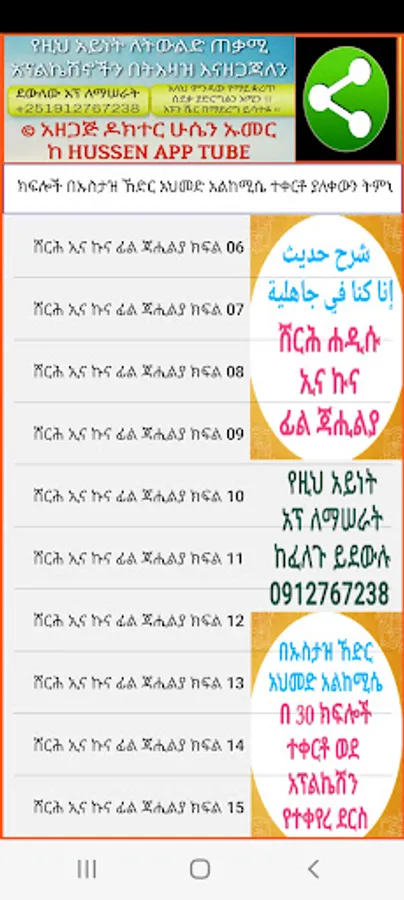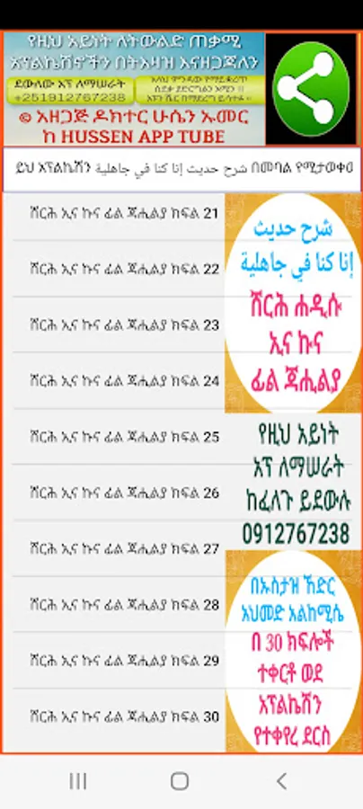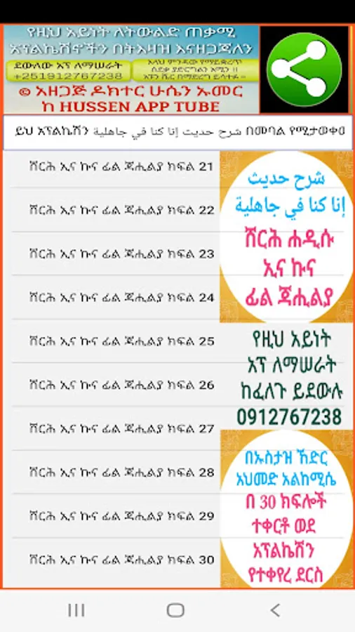 This app is designed in such a beautiful way by Dr. Hussain Umar, and we prepare Quran lessons, Hadith lessons and also Tafsir applications by order. You can reach us on this phone number 251912767238