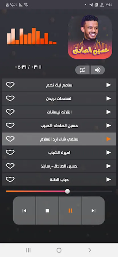 The application contains the latest songs of the Sudanese artist, Dr. Hussein Al-Sadiq, the most listened to 2023, and it works without the Internet... The songs are characterized by high audio quality and the ability to hear them in the background with the automatic change of music and songs.